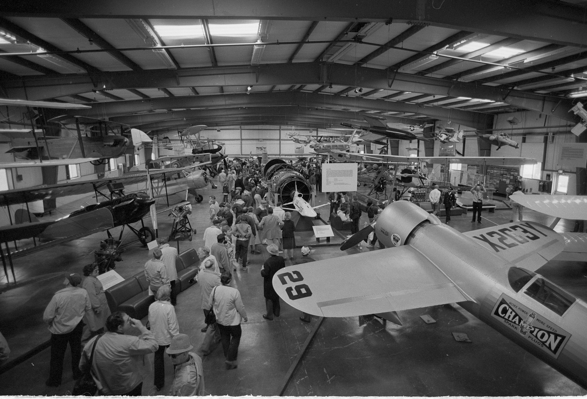 Visitors attending the 1983 open house at the National Air and Space Museum's Garber Facility for Preservation, Restoration and Storage. The image shows visitors walking amongst various airplanes.