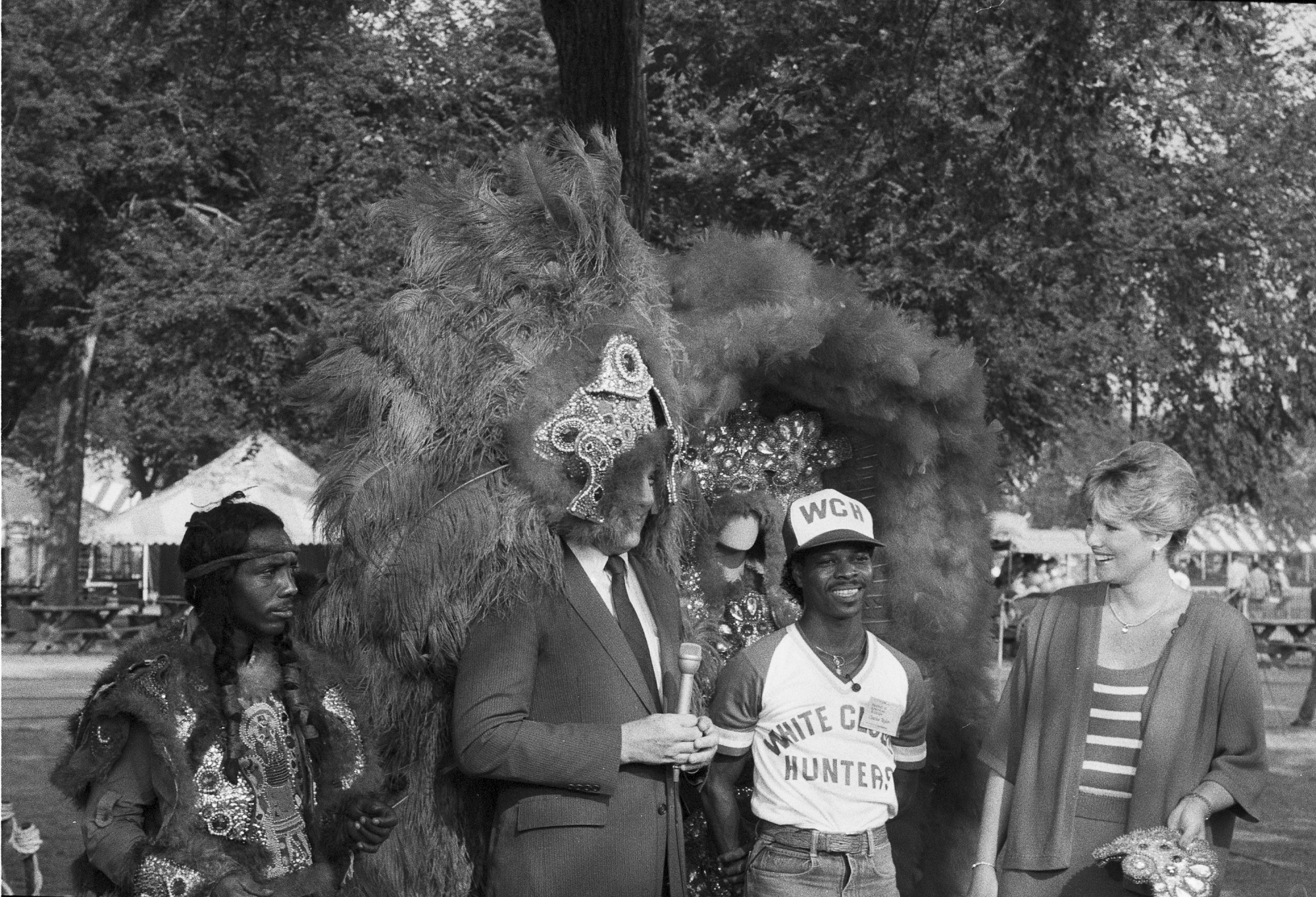 Good Morning America anchors Steve Bell (r.) and Joan Lunden interview Chief Charles Taylor at the Festival of American Folklife on July 4, 1985. The festival is now known as the Smithsonian Folklife Festival.