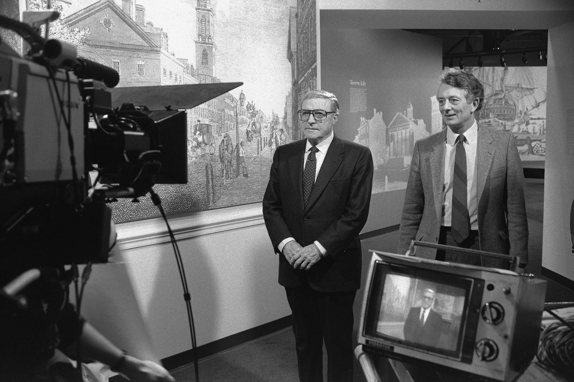 Actor Gene Kelly (l.) while being filmed at National Museum of American History's "After the Revolution" exhibit on December 4, 1985 for a 90-minute production called "American Treasure - A Smithsonian Journey," that was to air in March, 1986. He is seen here with the show's producer/director Christopher Sarson, best known for his work on "Masterpiece Theater."