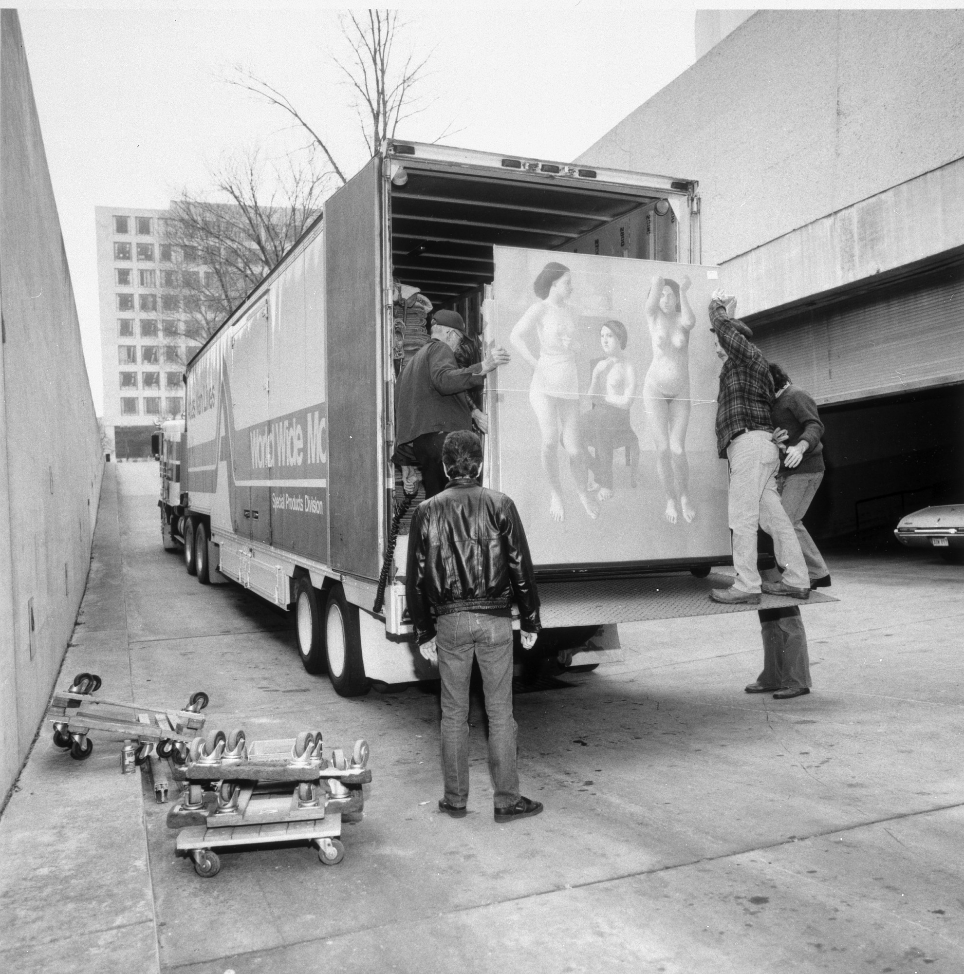 Hirshhorn Museum and Sculpture Garden staffers unloading Alan Feltus' "Three Women" (1973), one of the large number of paintings, drawings and sculpture from the Joseph Hirshhorn bequest that arrived from the New York City warehouse where they were kept previously. This bequest added about 5,500 additional works to the collection. Photograph shows painting being unloaded at the garage at the side (7th and Independence) of the Museum.