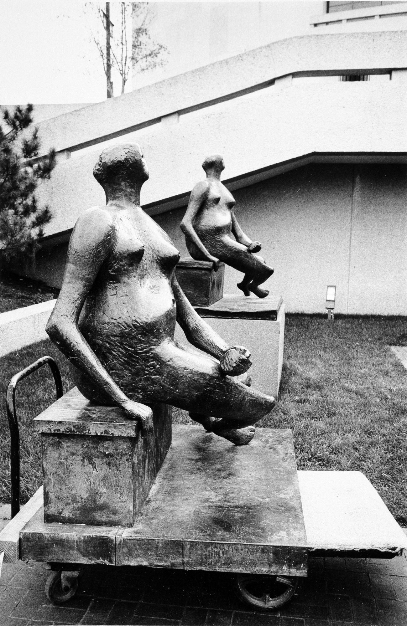 Two casts of Henry Moore's bronze "Seated Figure" (1956-1957) in a corner of the Hirshhorn Museum and Sculpture Garden's Sculpture Garden. Later the sculpture on the left was to replace the one on the right. A bequest of approximately 5,500 items was delivered to the Museum earlier in 1986, some of which were duplicate casts of previously acquired works.