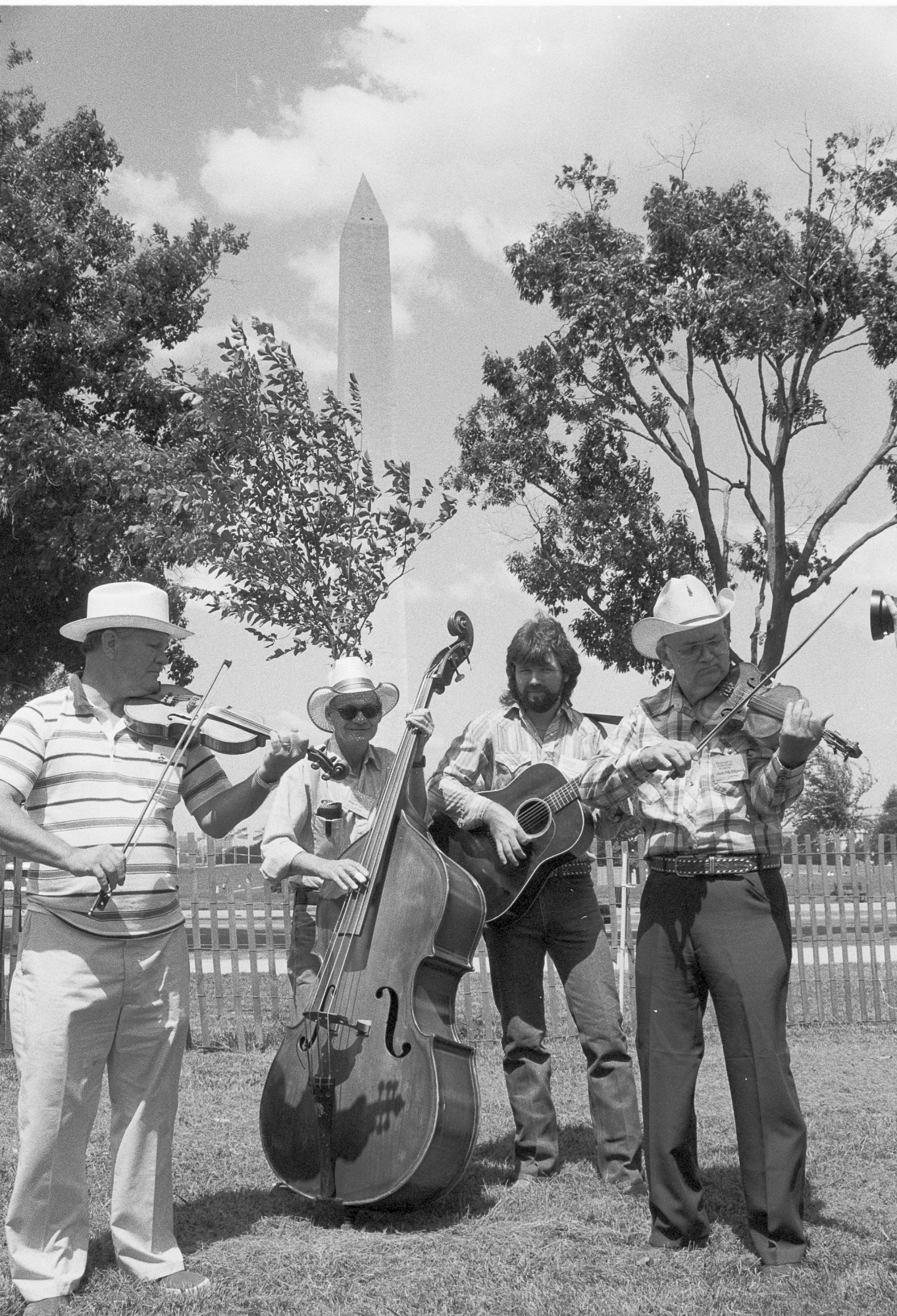 At the 1985 Festival of American Folklife, the Hayride String Band performs. The Washington Monument is visible in the background.