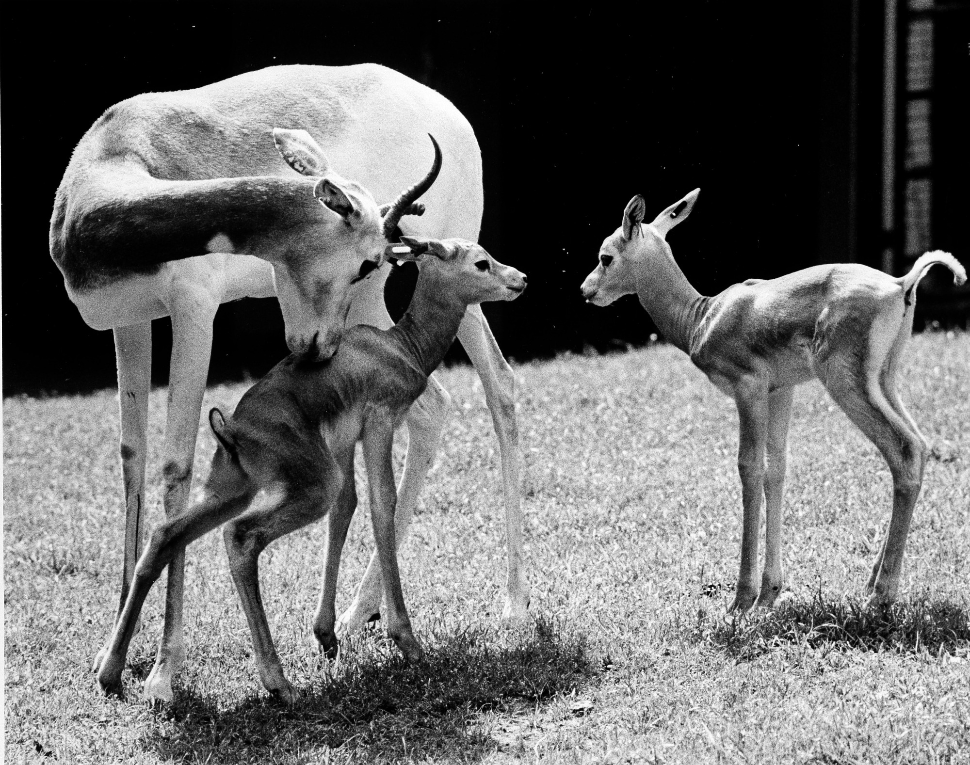 Two of the four dama gazelles born at the National Zoological Park in 1986. Photo shows two young gazelles playing with a mother gazelle in their outdoor yard.