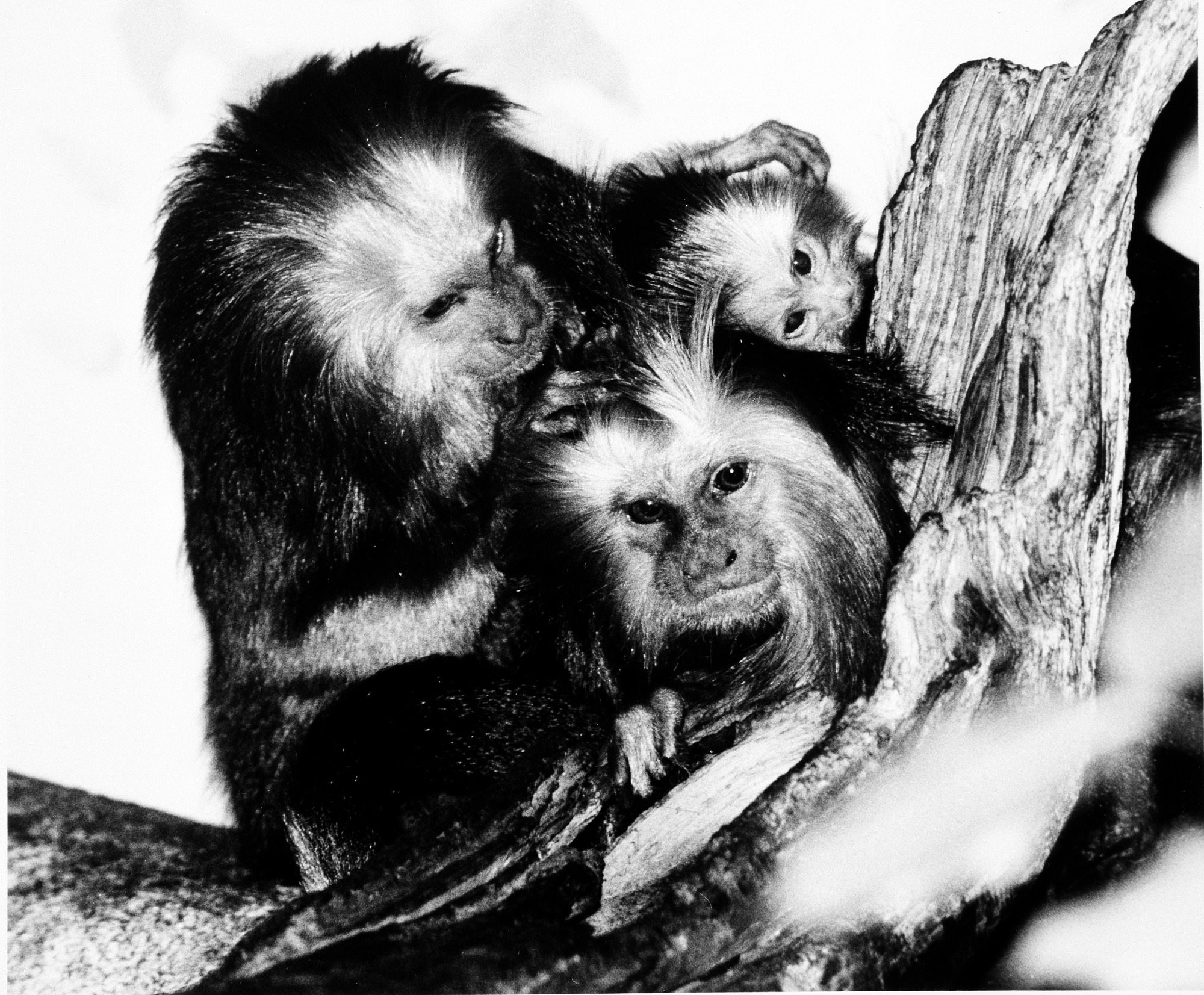 The first baby golden-headed lion tamarin ever born in captivity in North America was born at the National Zoological Park in August of 1986. Shown here is the father tamarin grooming the mother, who is carrying the baby on her back. They are in the Small Mammal House.