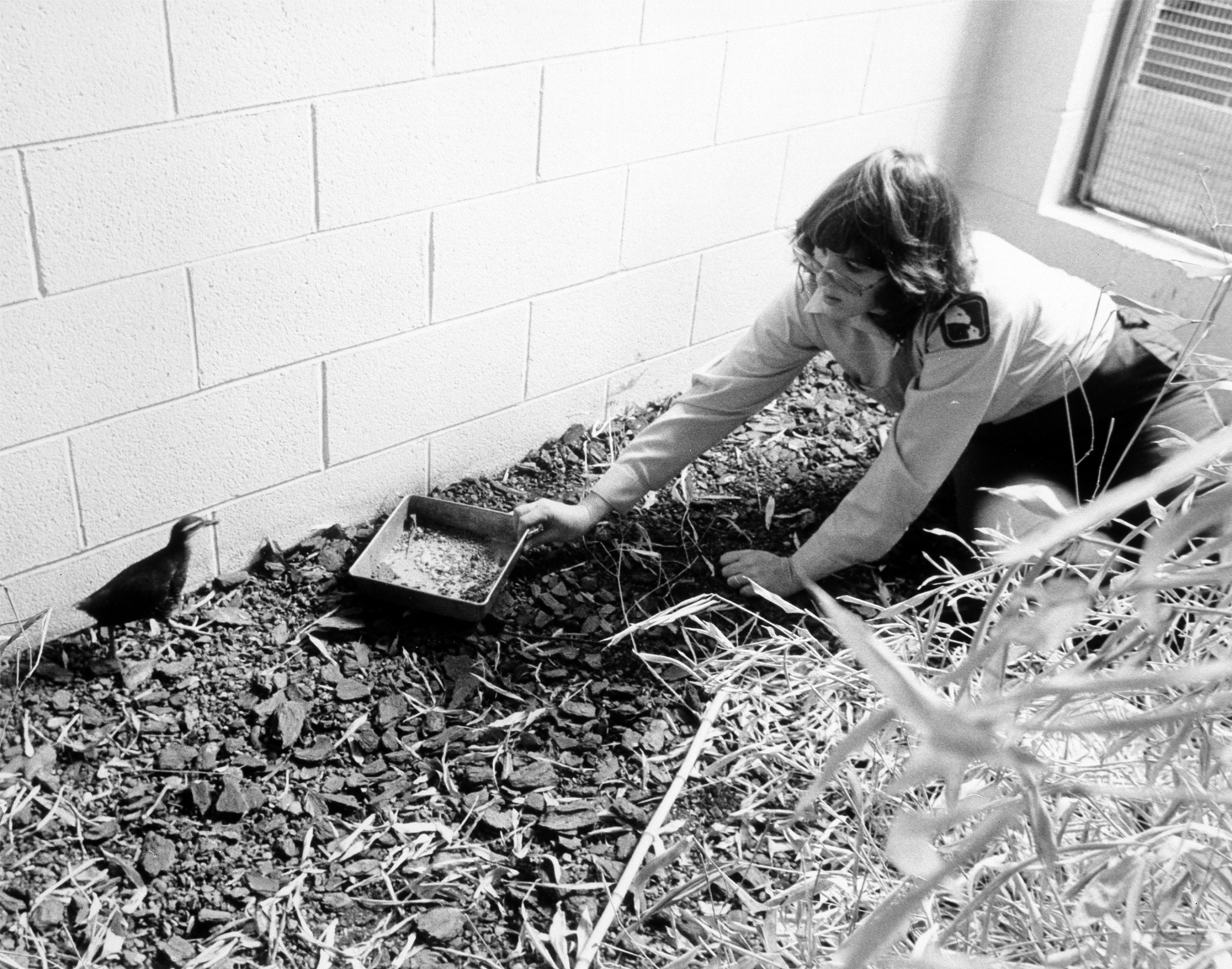 Conservation and Research Center keeper Ginnie Fristoe-Titus feeding a 9 inch tall flightless Guam rail in its enclosure. The Conservation and Research Center is part of the Smithsonian's National Zoological Park.