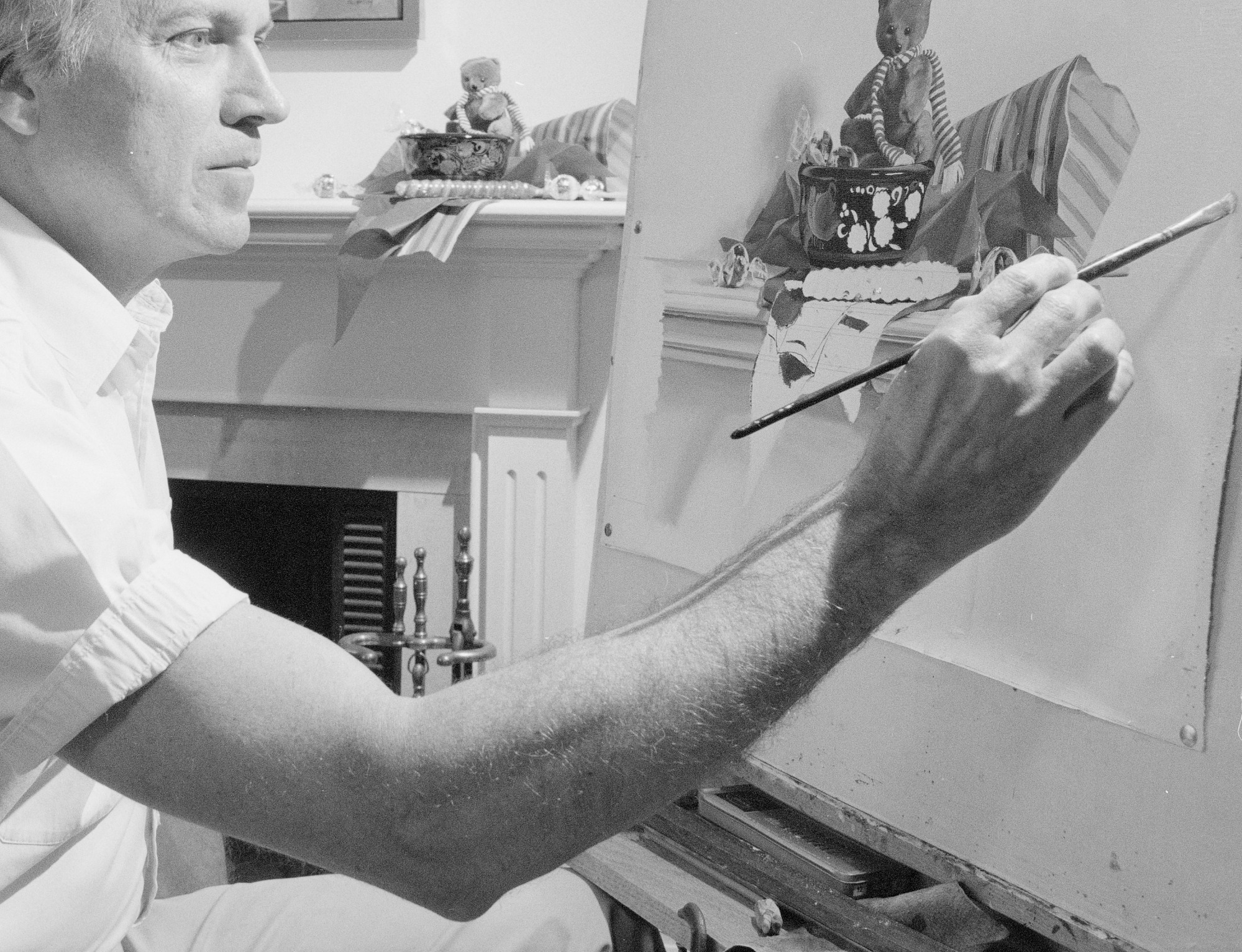 John Clendening, assistant chief of exhibit design at National Air and Space Museum, in his studio, where he paints every evening for two or three hours, with one of his recent teddy-bear paintings and the painting's subject in the background.