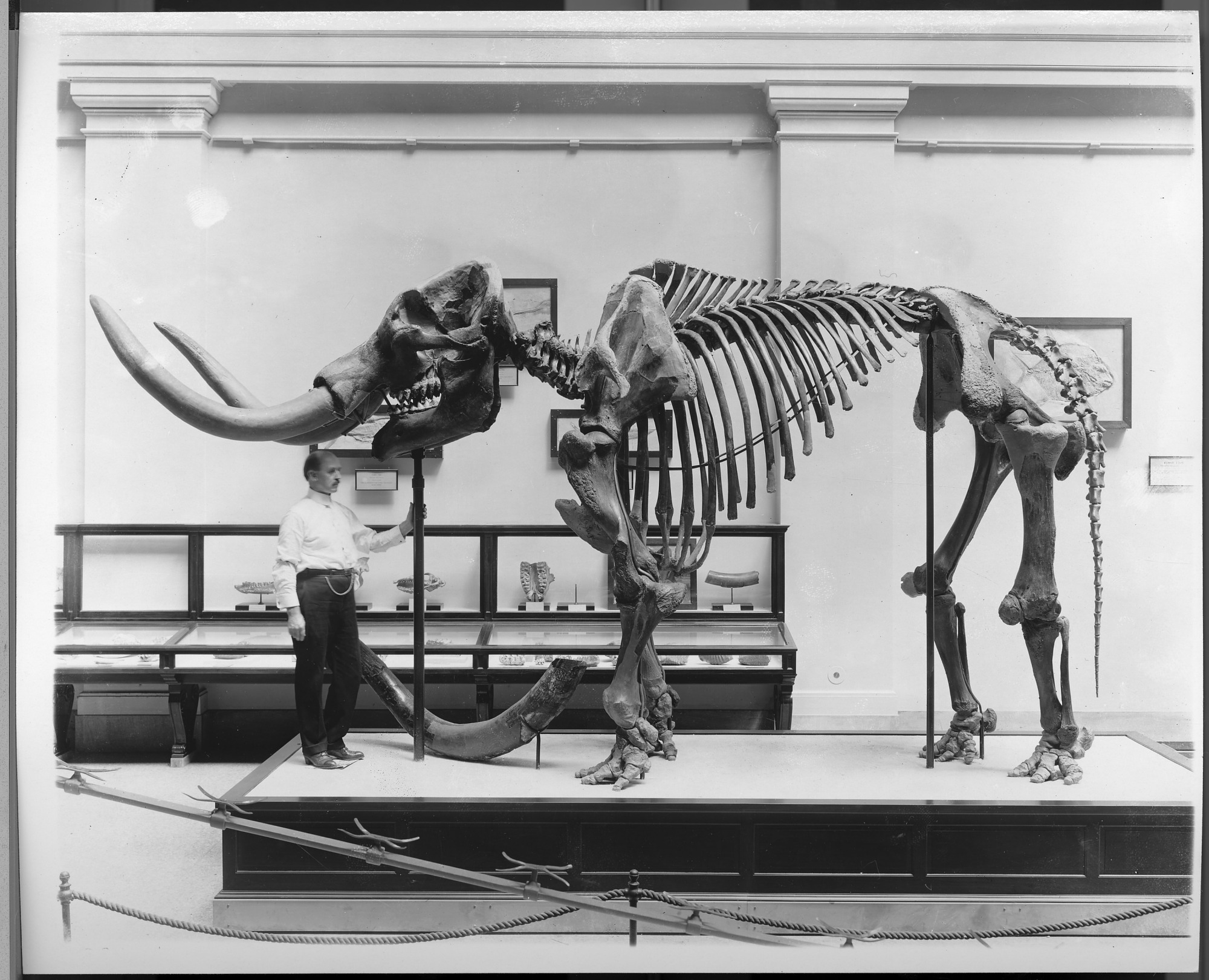 A museum employee stands under the head of an extinct, American mastodon on display in the Paleontology Exhibit ( c. 1917) in the United States National Museum, now the National Museum of Natural History. American Mastodons occupied woodland areas of North American from coast to coast and from Alaska to Central Mexico.