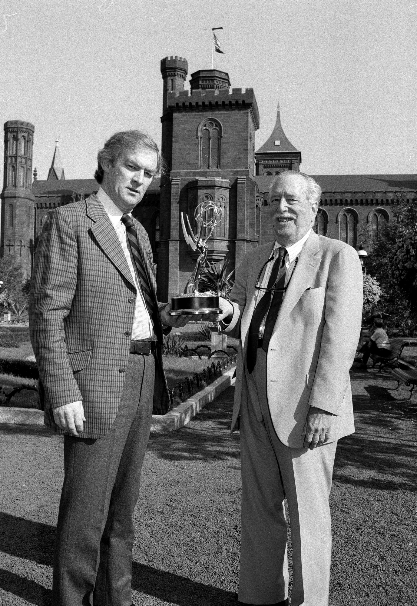 "Smithsonian World" executive producer Adrian Malone (l.) and SI television consultant Tom Wolf proudly display the Emmy Award for Outstanding Informational Series, which the series won at the September 12th Emmy Awards. 'Smithsonian World' also won an Emmy in 1985 for Outstanding Informational, Cultural or Historical Programming.