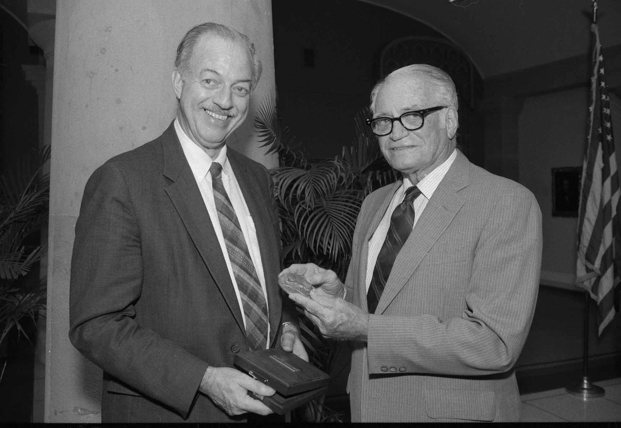 Smithsonian Secretary Robert McCormick Adams (l.) presents the Samuel P. Langley Medal for Aerodromics to Smithsonian Regent Emeritus Barry Goldwater, for his efforts in support of the National Air and Space Museum.