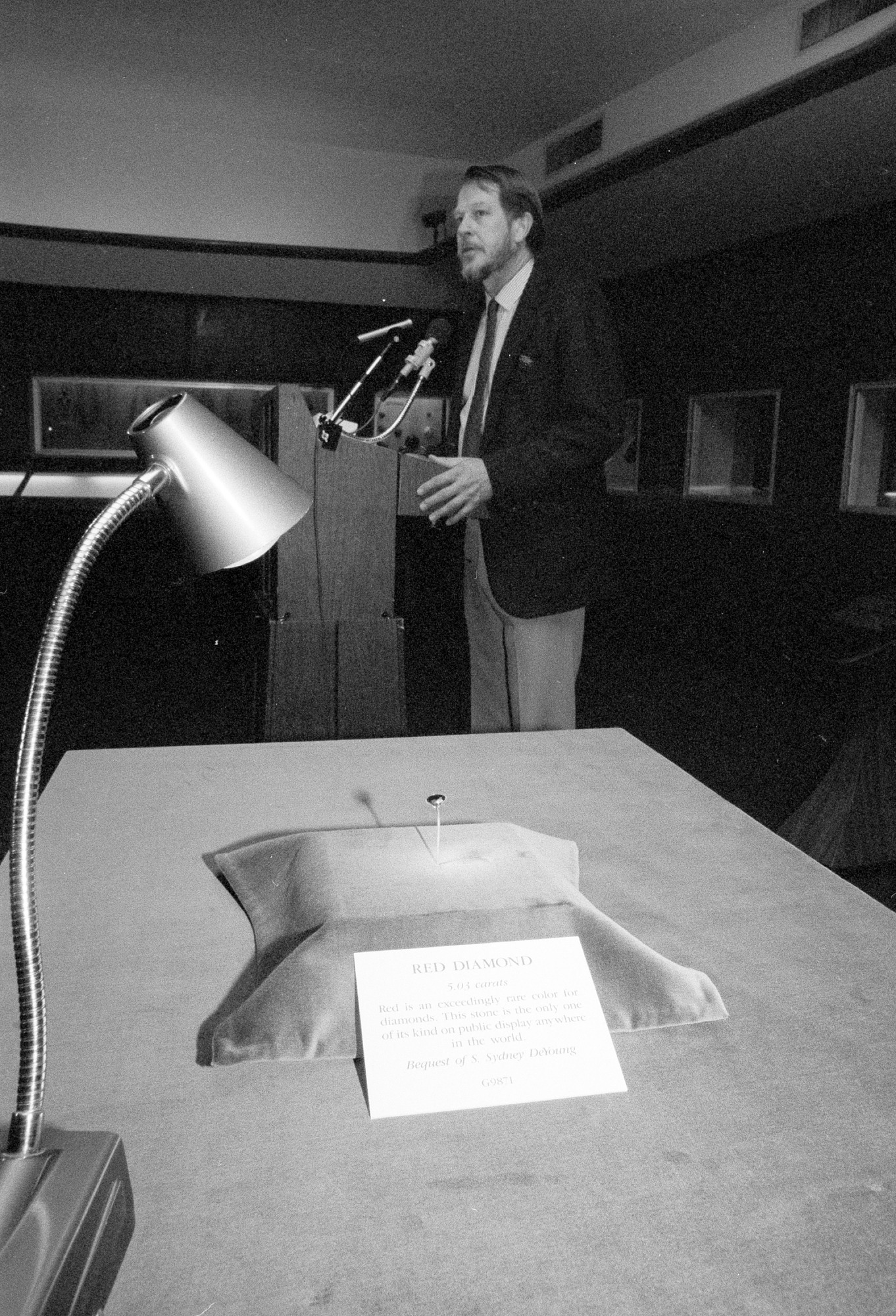 John White, curator-in-charge of the National Museum of Natural History's Mineral Sciences Department, at a press conference for a rare red diamond, on February 2, 1987. The diamond was newly acquired by the museum through a bequest of S. Sydney DeYoung.