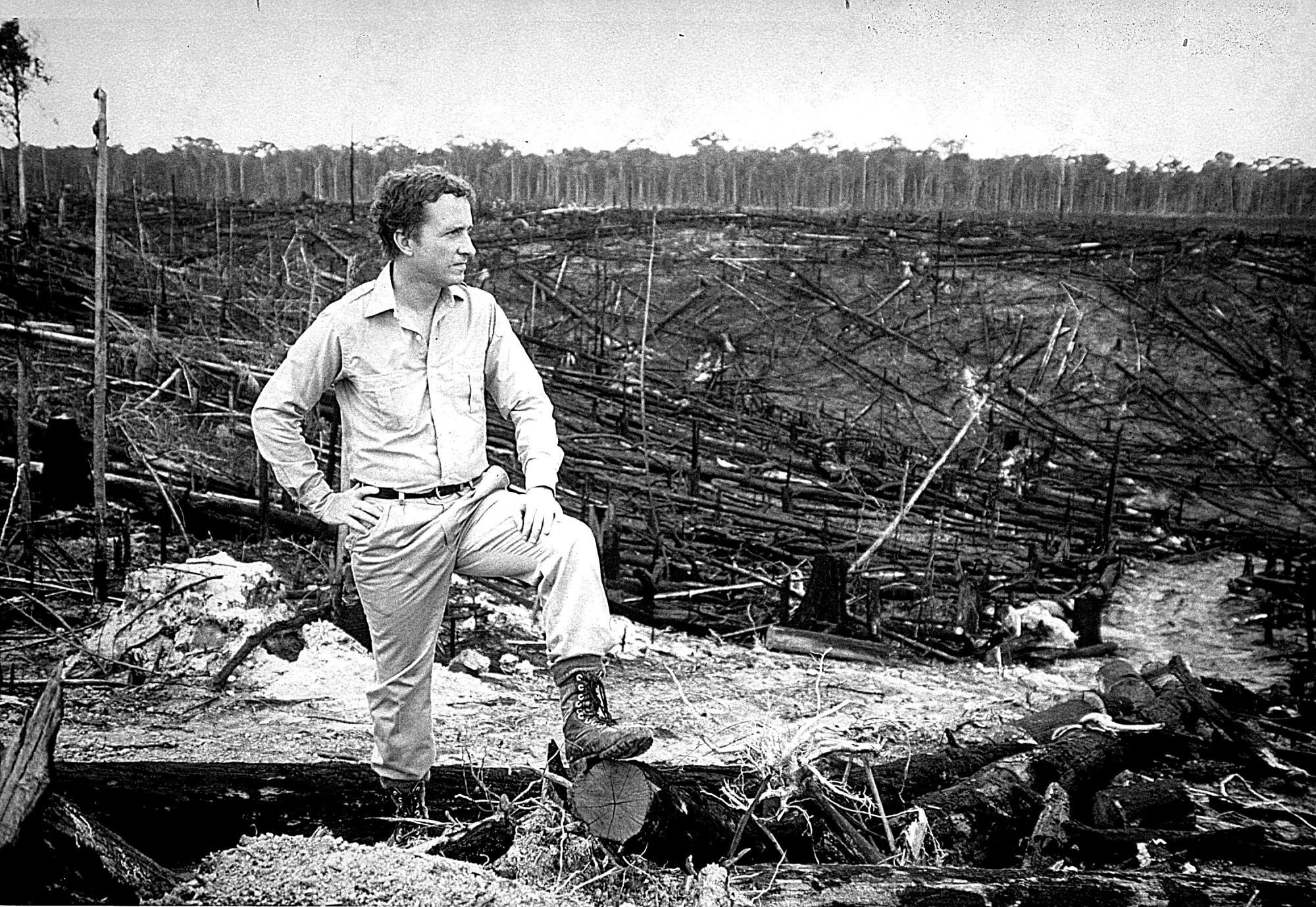 Thomas Lovejoy, ornithologist and a leading advocate for the preservation of the world's tropical rainforests, inspects a recently burned tract of rainforest near Manaus, Brazil in October 1986. Lovejoy was Assistant Secretary for External Affairs from 1987-1994.