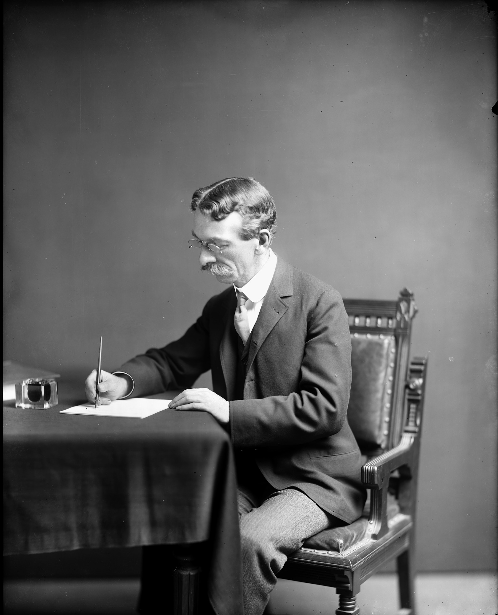 Richard Rathbun, Assistant Secretary of the Smithsonian Institution in charge of the United States National Museum, sits at a table writing. Rathbun supervised the organization of the newly chartered National Gallery of Art, now the National Museum of American Art, in the Arts and Industries Building in 1906. In 1880, Richard Rathbun became curator of the Department of Marine Invertebrates at the United States National Museum and was named Assistant Secretary in 1896. He became Director of the United States National Museum in 1898.