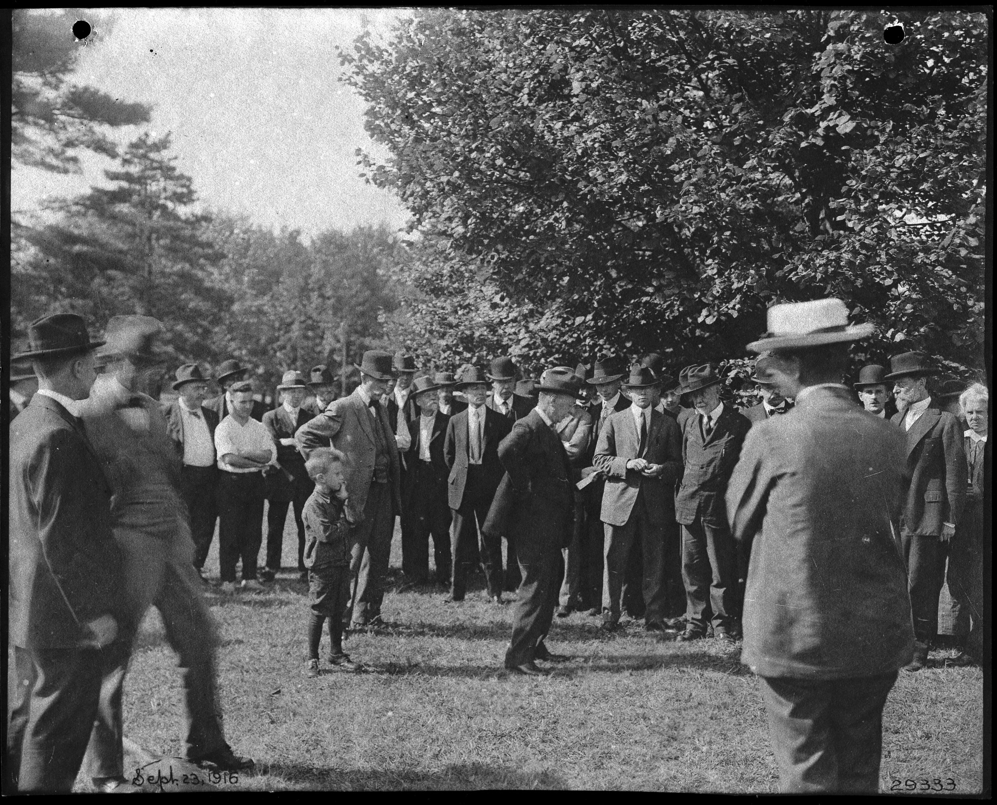 The ground-breaking for the Freer Gallery of Art on September 23, 1916. A crowd of people has formed a semi-circle to observe the event. While not all of the individuals are identified, several names are listed on the back of the print, including: H. W. Dorsey, C. R. Aschemeier, J. S. Pollock, Joseph Mace, George T. Mace, Richard Rathbun, Ms. M. V. Young, James G. Traylor, Charles Greeley Abbot (fifth Secretary of the Smithsonian Institution, 1928-1944), E. L. Springer, D. L. Stejneger, and Ms. M. E. deRonceray.