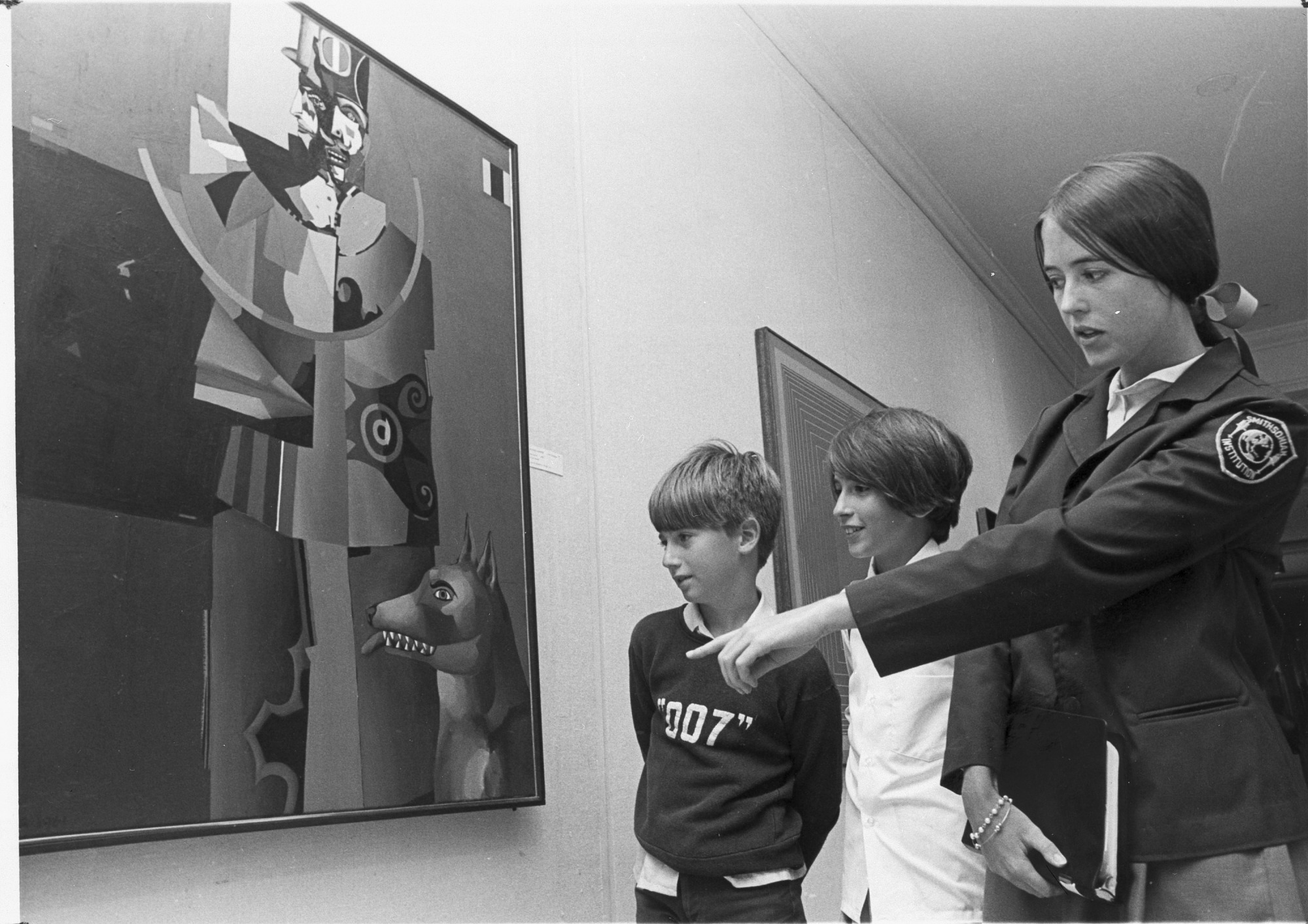 Laurel Arnold, a student from Mount Holyoke College, teaches two young visitors about a Richard Linder painting. She was part of a program designed by the Office of Academic Programs to generate interest among students in museum professions.