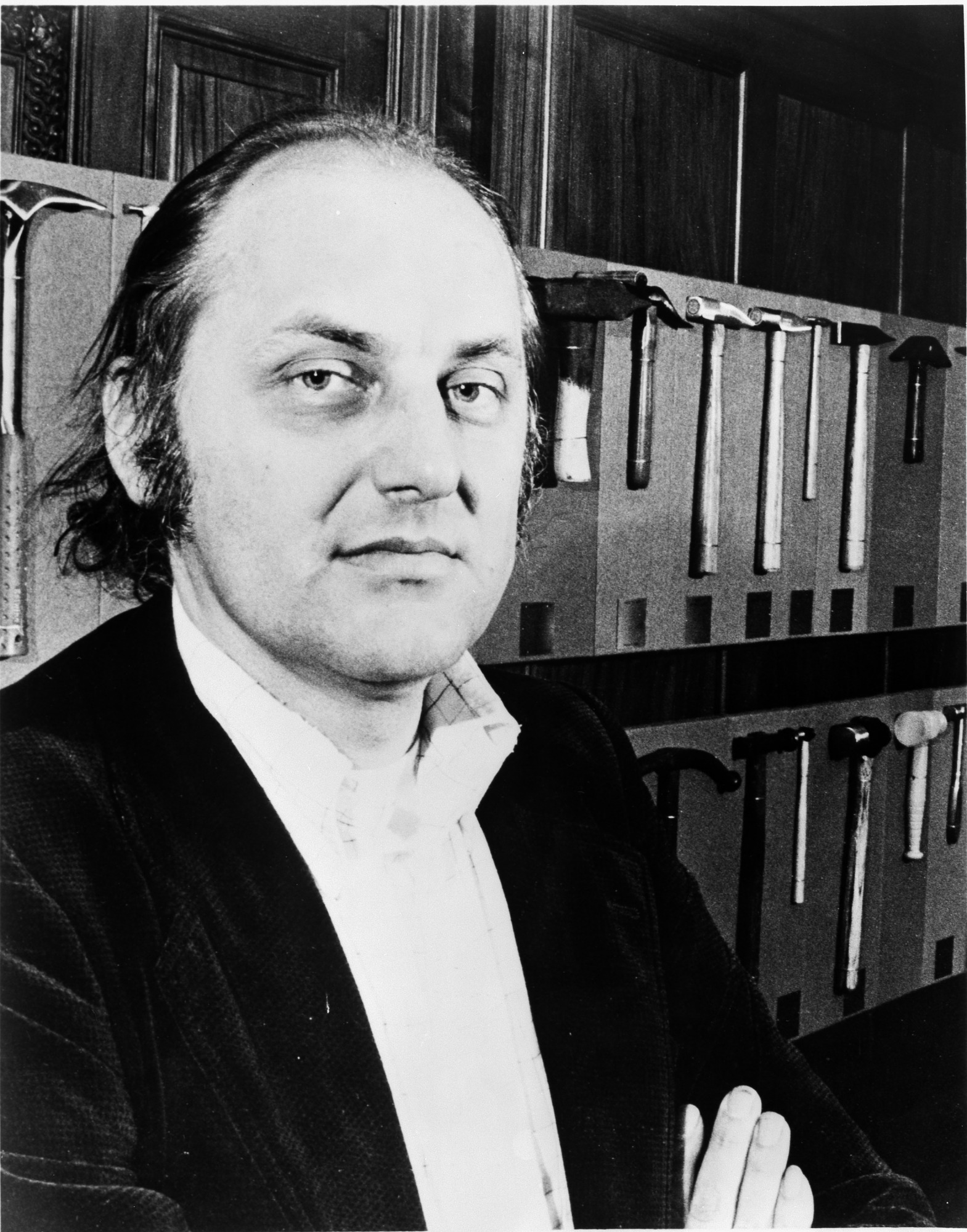 Austrian architect and designer Hans Hollein stand in front of his exhibit "Variations of a Product: Hammers" at the Cooper-Hewitt Museum of Decorative Arts and Design. The concept behind "MAN TRANSFORMS", the opening exhibition of the museum in its new home in the renovated Carnegie Mansion, was Hollein's creation.