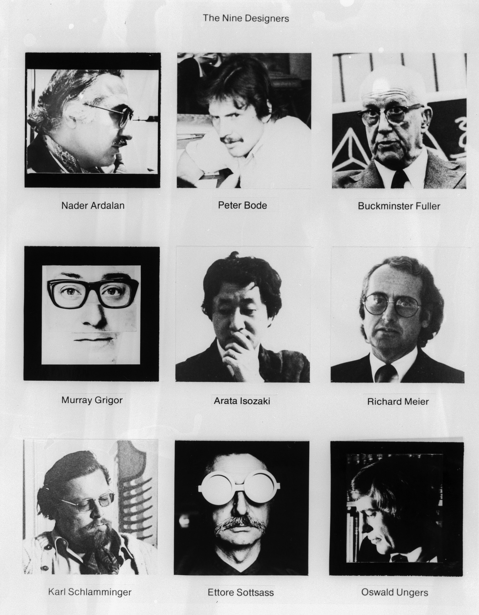 The nine designers, who worked with Hans Hollein in the "MAN TRANSFORMs" exhibition at the Cooper-Hewitt Museum of Decorative Arts and Design, are pictured individually: Nader Ardalan, Peter Bode, Buckminster Fuller, Murray Grigor, Arata Isozaki, Richard Meier, Karl Schlamminger, Ettore Sottsass, and Oswald Ungers.