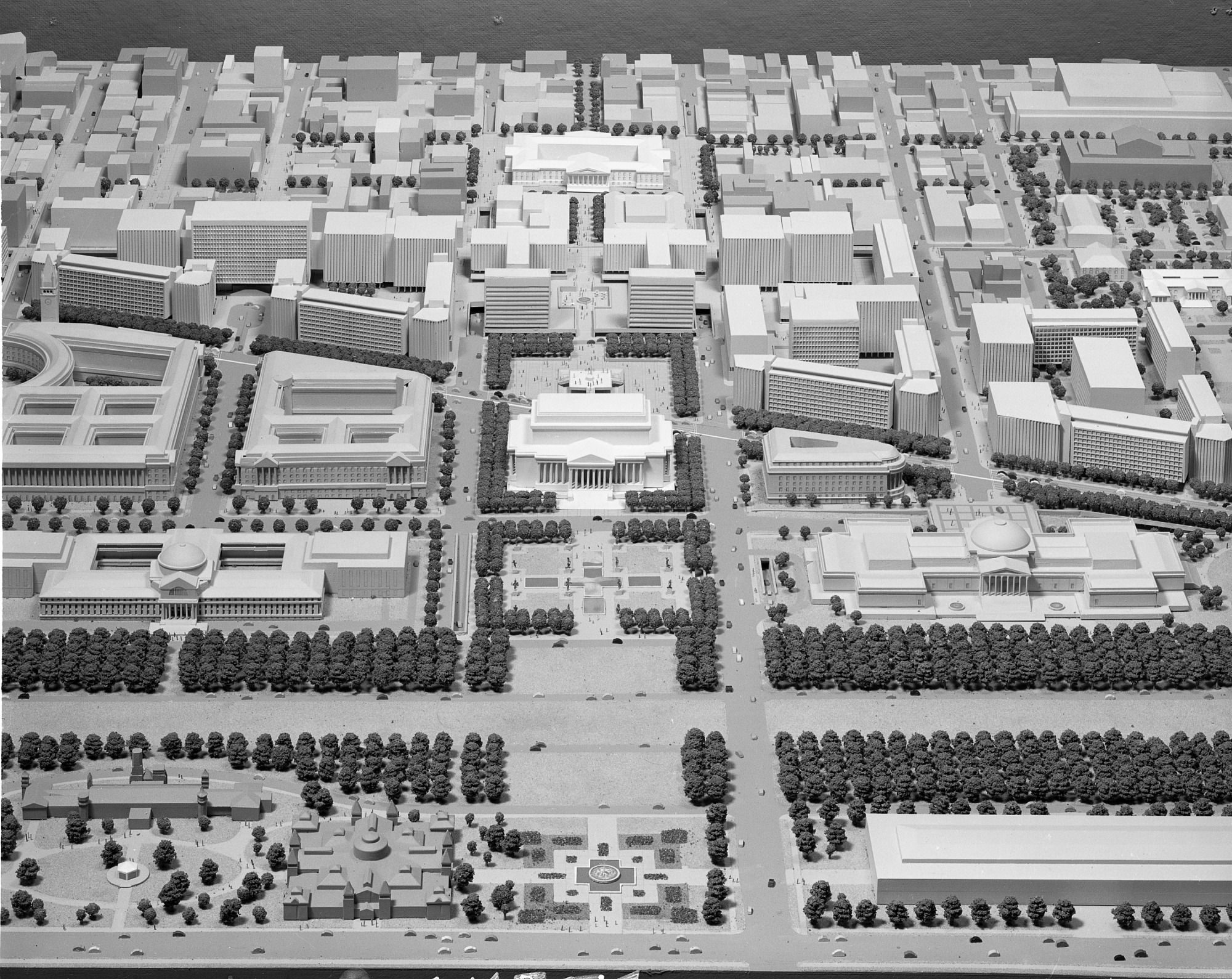 Photograph of a model of buildings in the Pennsylvania Avenue area. It includes the National Gallery of Art, National Archives, Arts and Industries Building, Smithsonian Institution Building, National Museum of Natural History (with wings), on the Mall, and the Old Patent Office Building, now the National Portrait Gallery and Smithsonian American Art Museum. This model was created before the existence of the Hirshhorn Museum and Sculpture Garden and National Air and Space Museum.