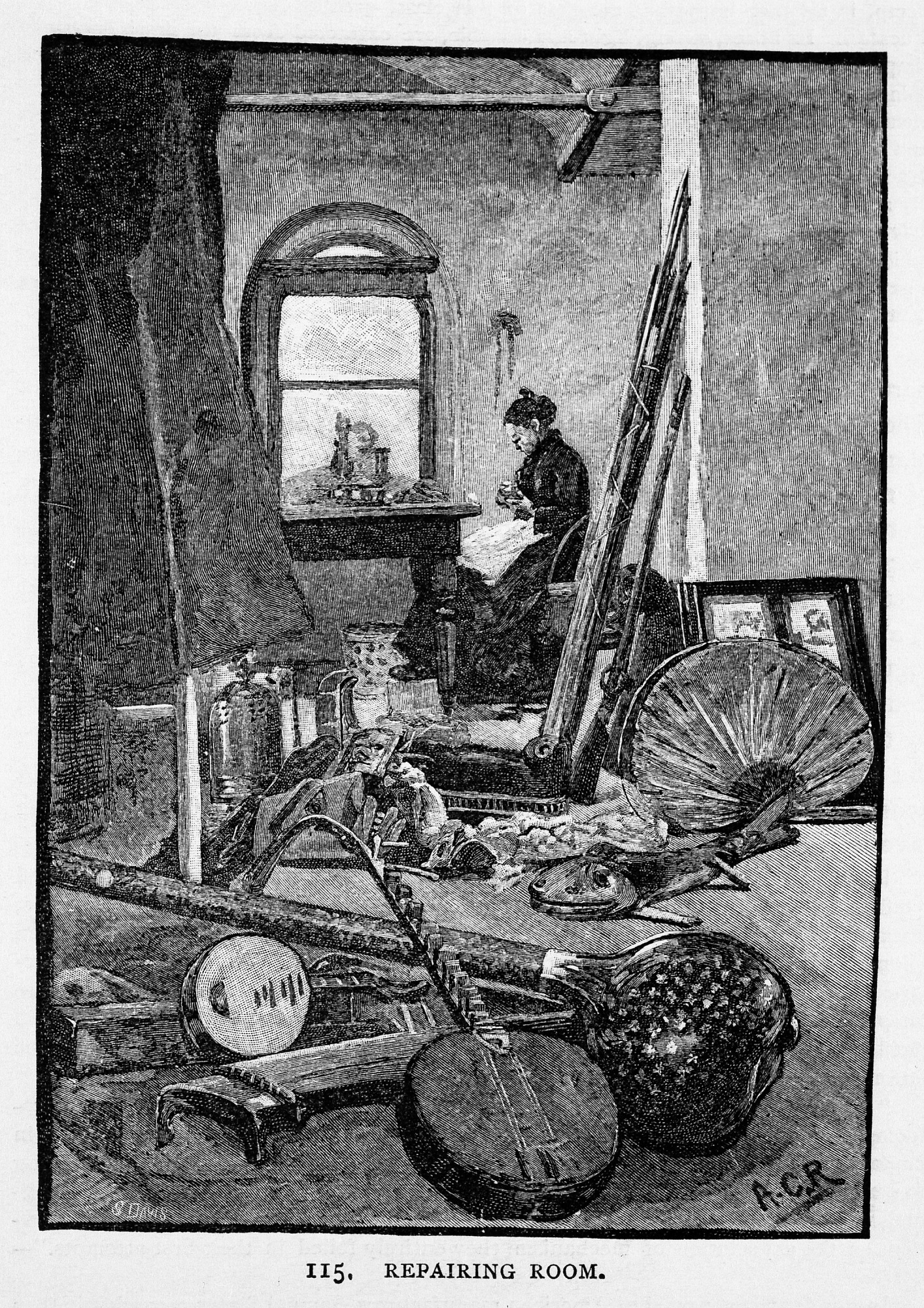 Illustration (Fig. 115) in "A Handbook to the National Museum under the direction of the Smithsonian Institution, Washington " of a woman at work at a table repairing ethnological artifacts in the United States National Museum, now the Arts and Industries Building. Many artifacts are scattered on the floor.