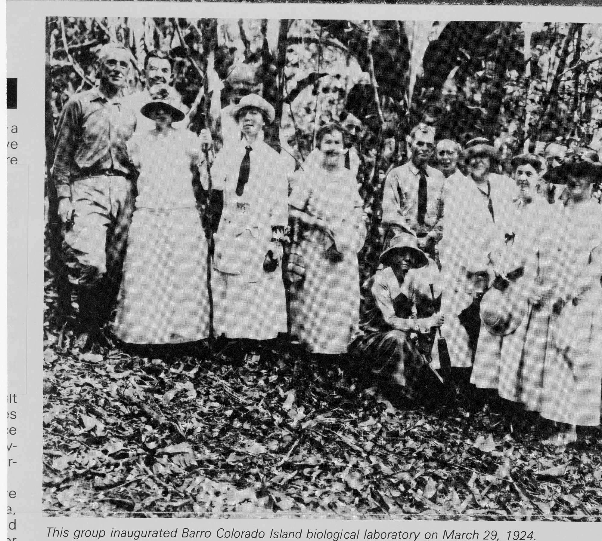 At the inauguration of the Barro Colorado Island Biological Laboratory, this first group of scientists and guests visit the nature preserve and biological laboratory established on Barro Colorado Island. BCI was created when the Chagras River was dammed to create Gatun Lake as a watershed for the Panama Canal. The mountaintop island was set aside as a preserve for visiting North American naturalists. It was funded by a consortium until 1946 when the Canal Zone Biological Area, later (1966) renamed Smithsonian Tropical Research Institute, was transferred to the Smithsonian.