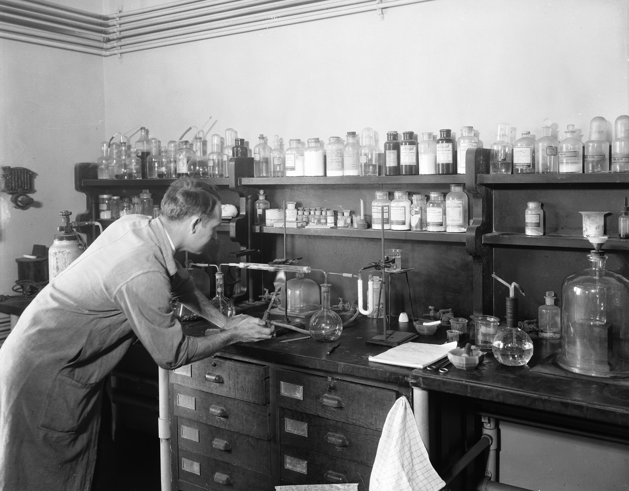 In a corner of the mineralogical laboratory in the Department of Geology, Edward Porter Henderson, 1898-1992, Geologist, Curator of Meteorites, United States National Museum (USNM), conducts an experiment on a meteorite . Henderson specialized in the study of meteorites for the USNM. He was a chemist at the United States Geological Survey (USGS) from 1920 to 1929. In 1929, he was appointed Curator of Physical and Chemical Geology in the Department of Geology of the USNM, where he remained until his retirement as Curator of the Division of Meteorites in the Department of Mineral Sciences, in 1965. He is noted for development of the national collections, research techniques, field work and post-war work in Japan for the United States Army.