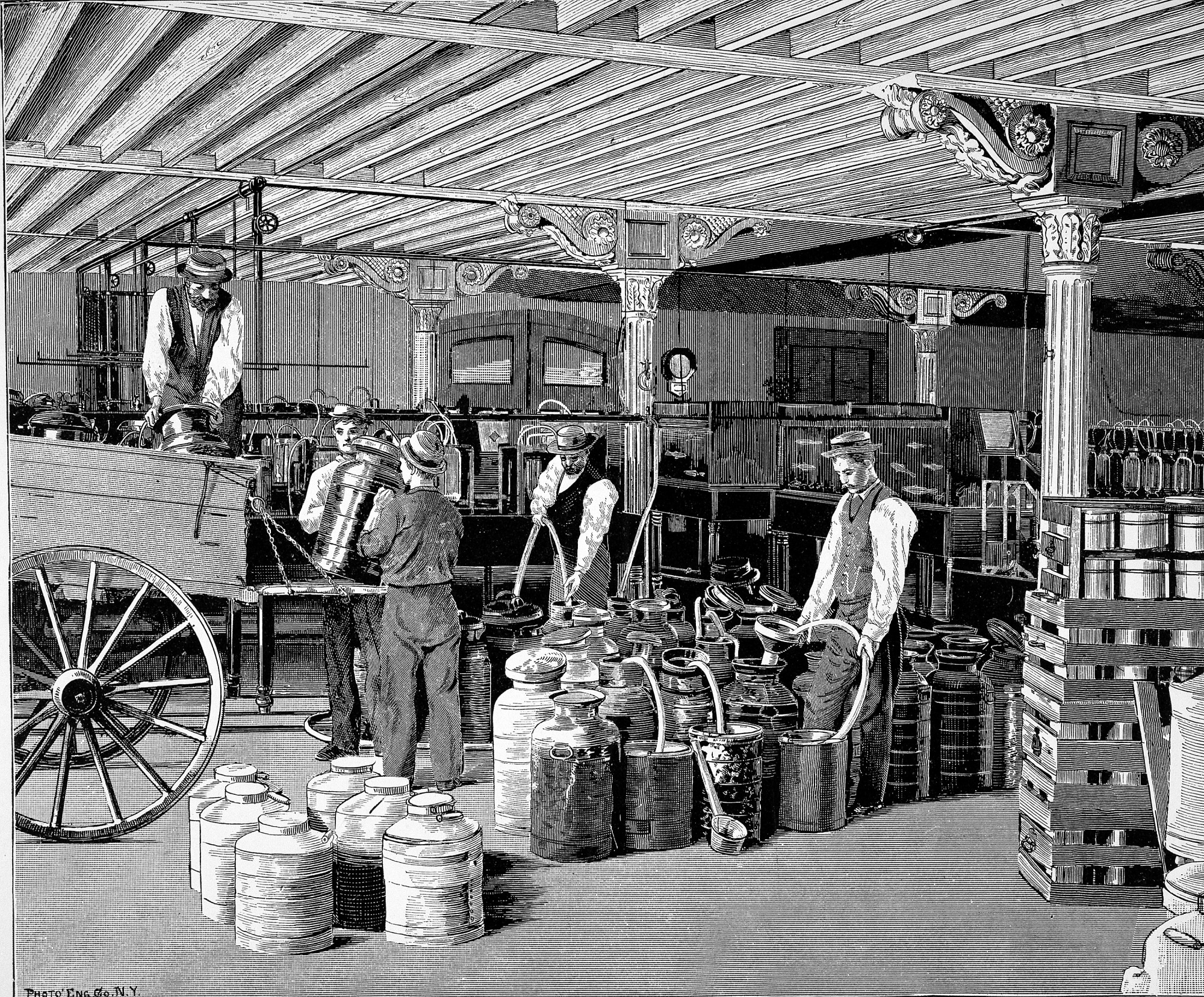 United States Fish Commission laboratories in the Armory Building in Washington, D.C., c. 1880s. Five members of the Fish Commission staff are moving containers with results of fish culture. Fish tanks are visible in rear.