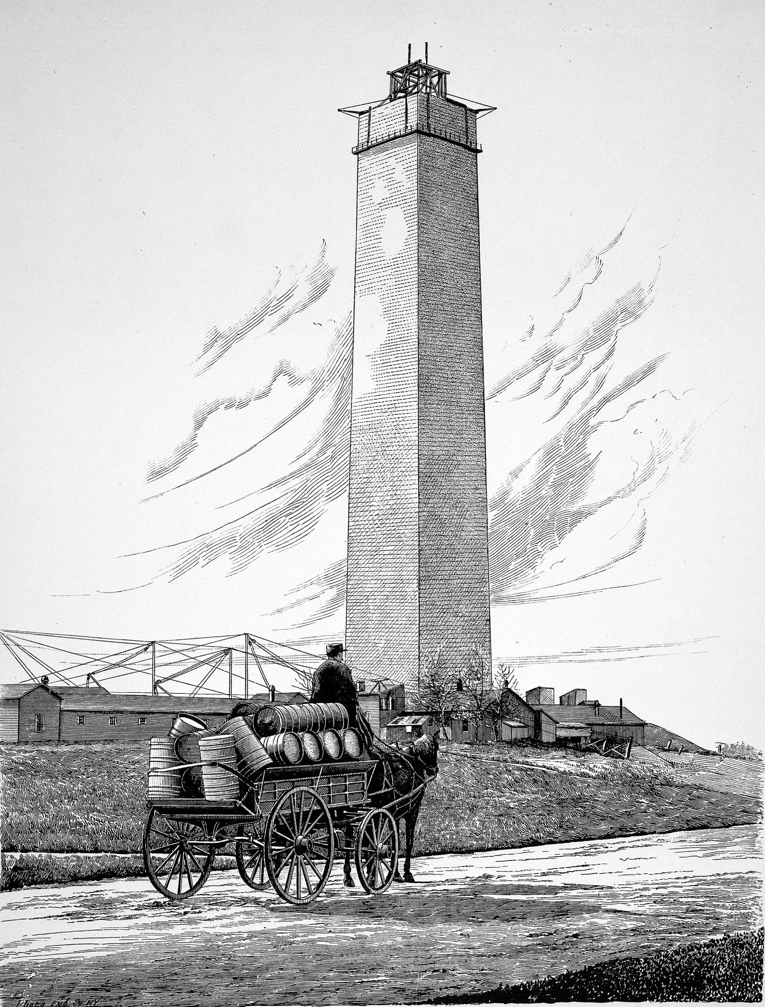 View of the United States Fish Commission buildings at the National Carp Ponds on the grounds of the Washington Monument, c. 1880s. A driver is delivering containers of specimens in a horse-drawn cart in foreground. Partially built Washington Monument is visible in rear.