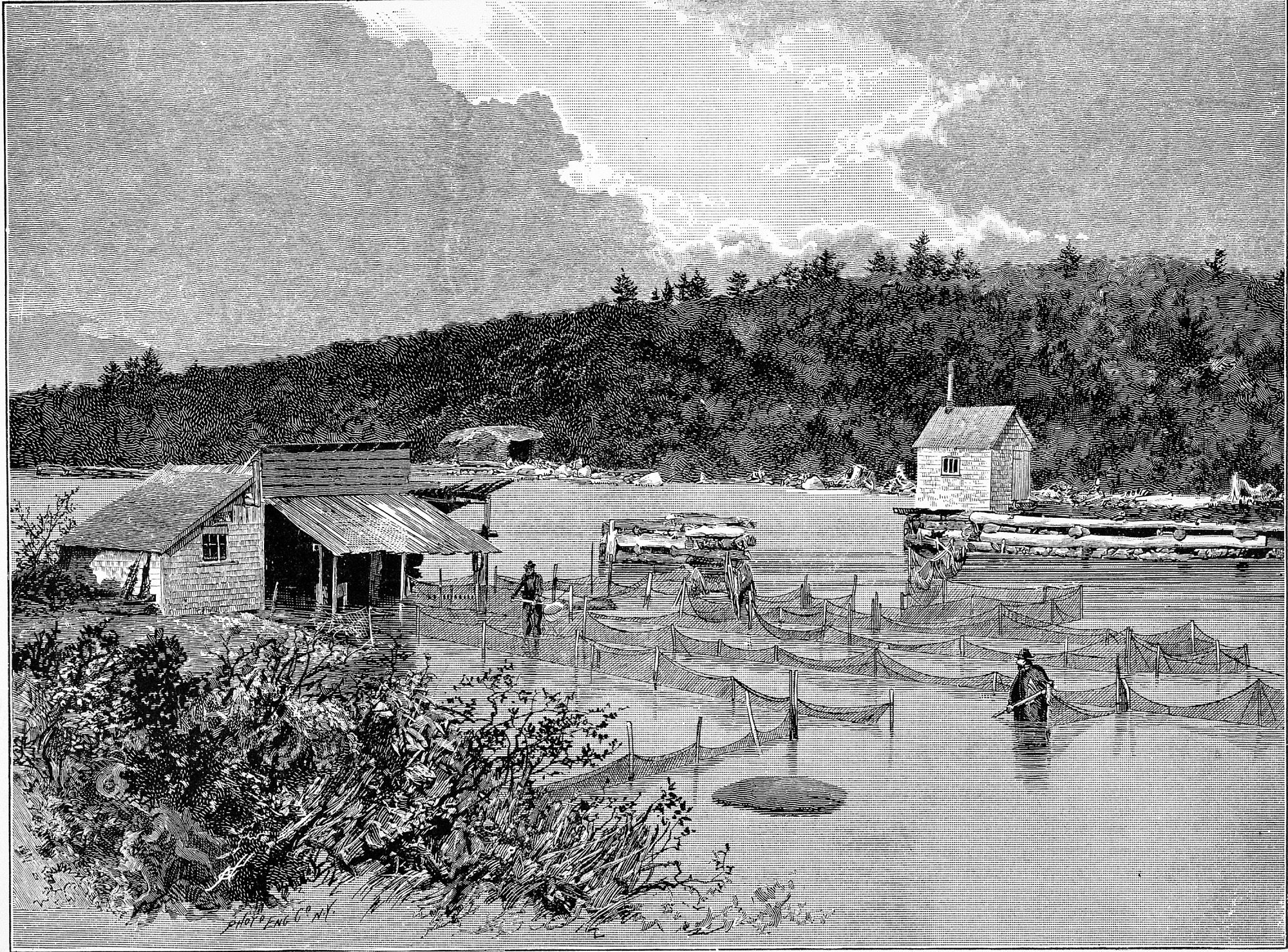 A United States Fish Commission site, with net enclosures in a fish pond, c. 1880s. Three staff members are working in the water. Buildings are located on shore to right and left. Location unknown (May be Penobscot).