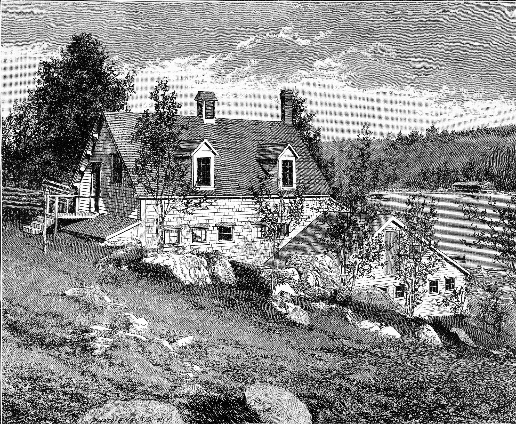 View of a house along the shore of a pond, presumably belonging to the United States Fish Commission, c. 1880s. Location unknown, perhaps New England.