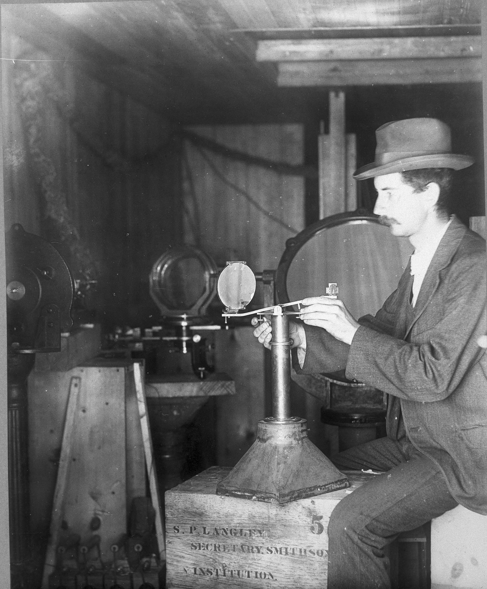 Charles Greeley Abbot, then Acting Director of the Smithsonian Astrophysical Observatory (SAO), pictured with bolometric apparatus, was one of a team of Smithsonian scientists who traveled to Wadesboro, North Carolina, to study an eclipse of the sun in 1900. Abbot later became director of the SAO and Fifth Secretary (1928-1944) of the Smithsonian.