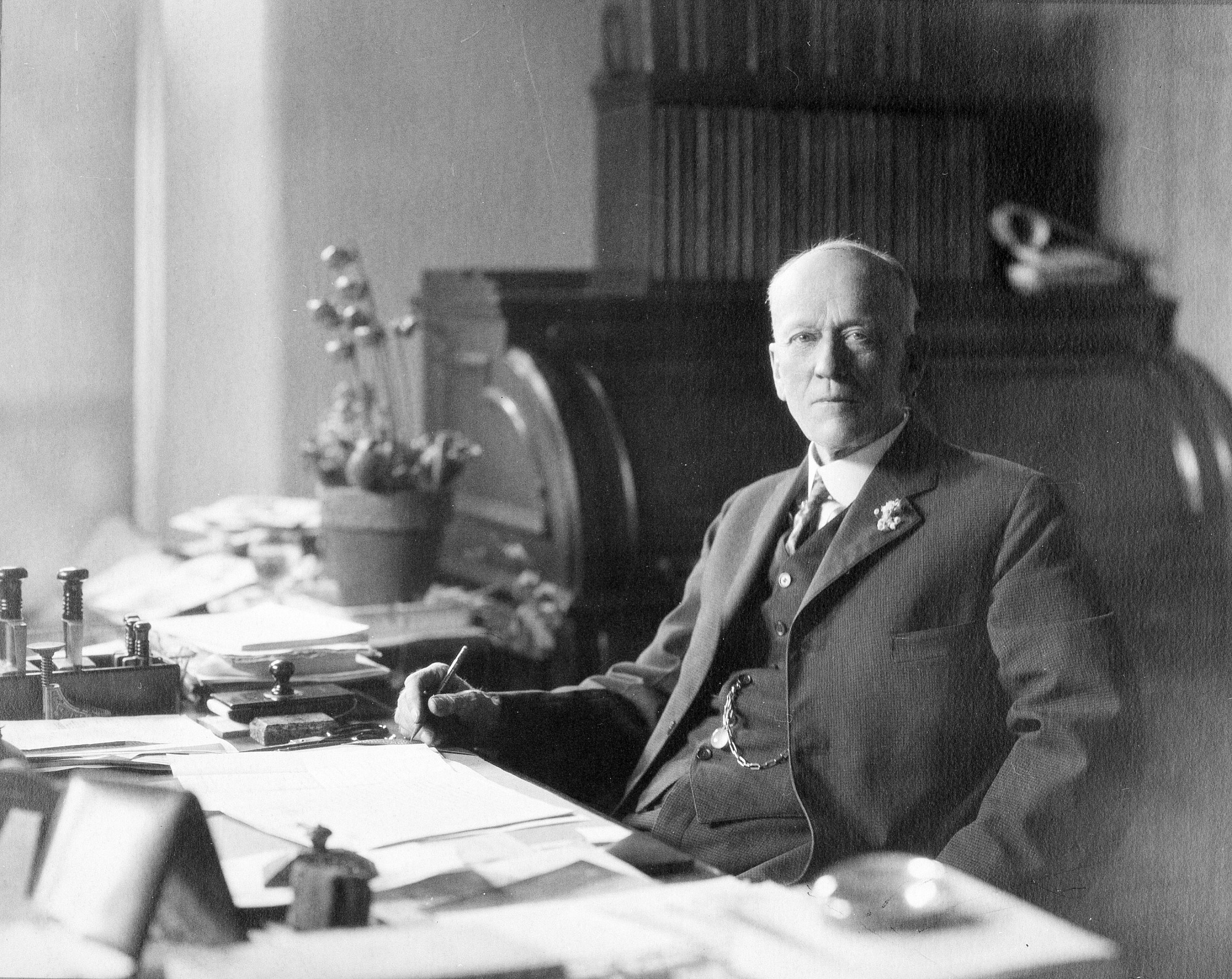 Charles Doolittle Walcott (1850-1927), paleontologist and fourth Secretary of the Smithsonian Institution from 1907 to 1927. Walcott is seated at his desk writing.