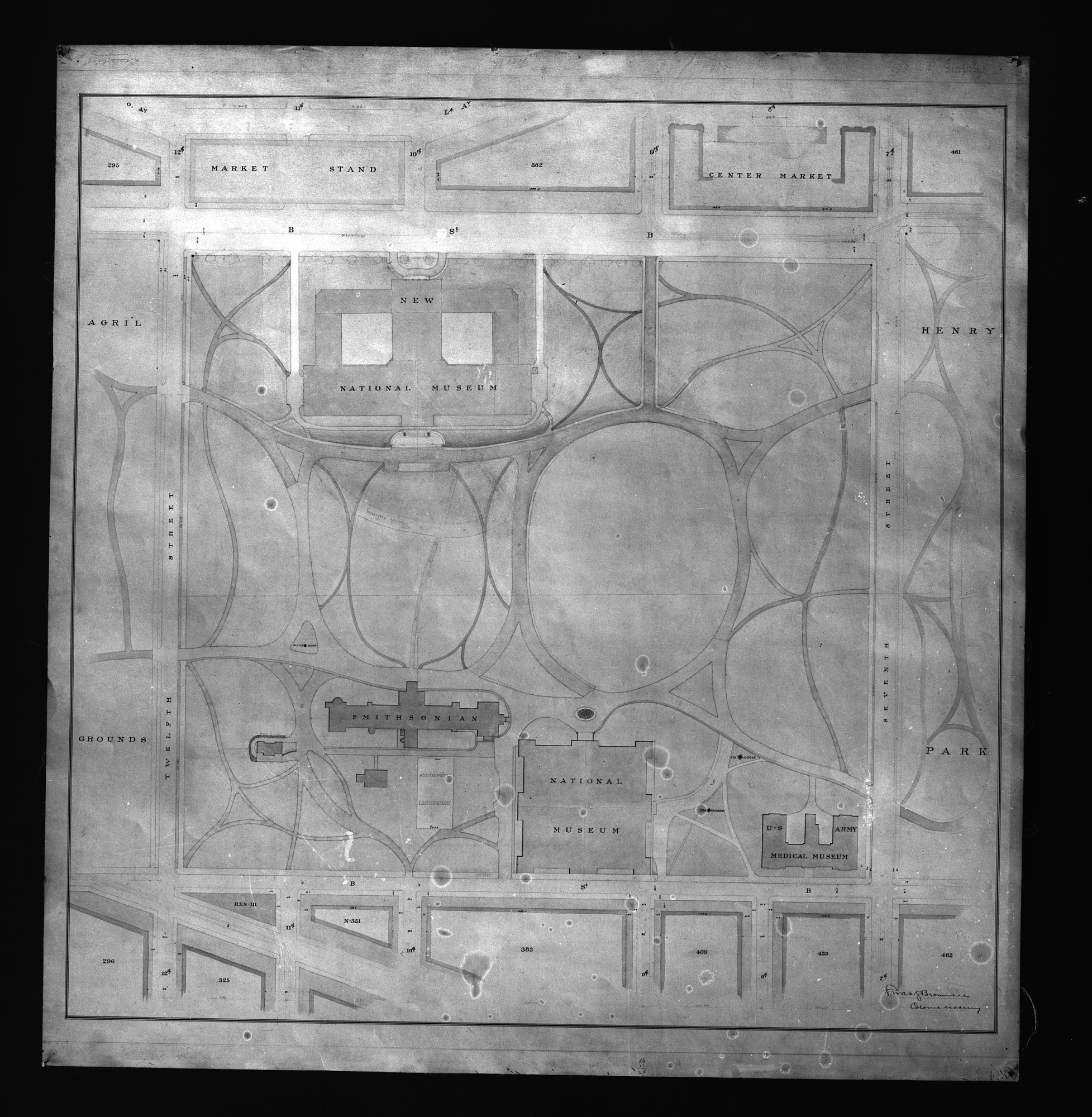 Plan of Smithsonian Grounds between 7th and 12th Streets, identifies where the new U.S. National Museum Building, now the National Museum of Natural History, is to be built. Also shows the Smithsonian Institution Building (and behind it the Astrophysical Observatory, the Annex, the Laboratory of Natural History shed), the Henry statue, the Arts and Industries Building (then known as the National Museum), the Army Medical Museum building, and the markets on B Street (now known as Constitution Avenue). Mall landscaping shows winding paths, as conceived by Andrew Jackson Downing in his 1851 plan.