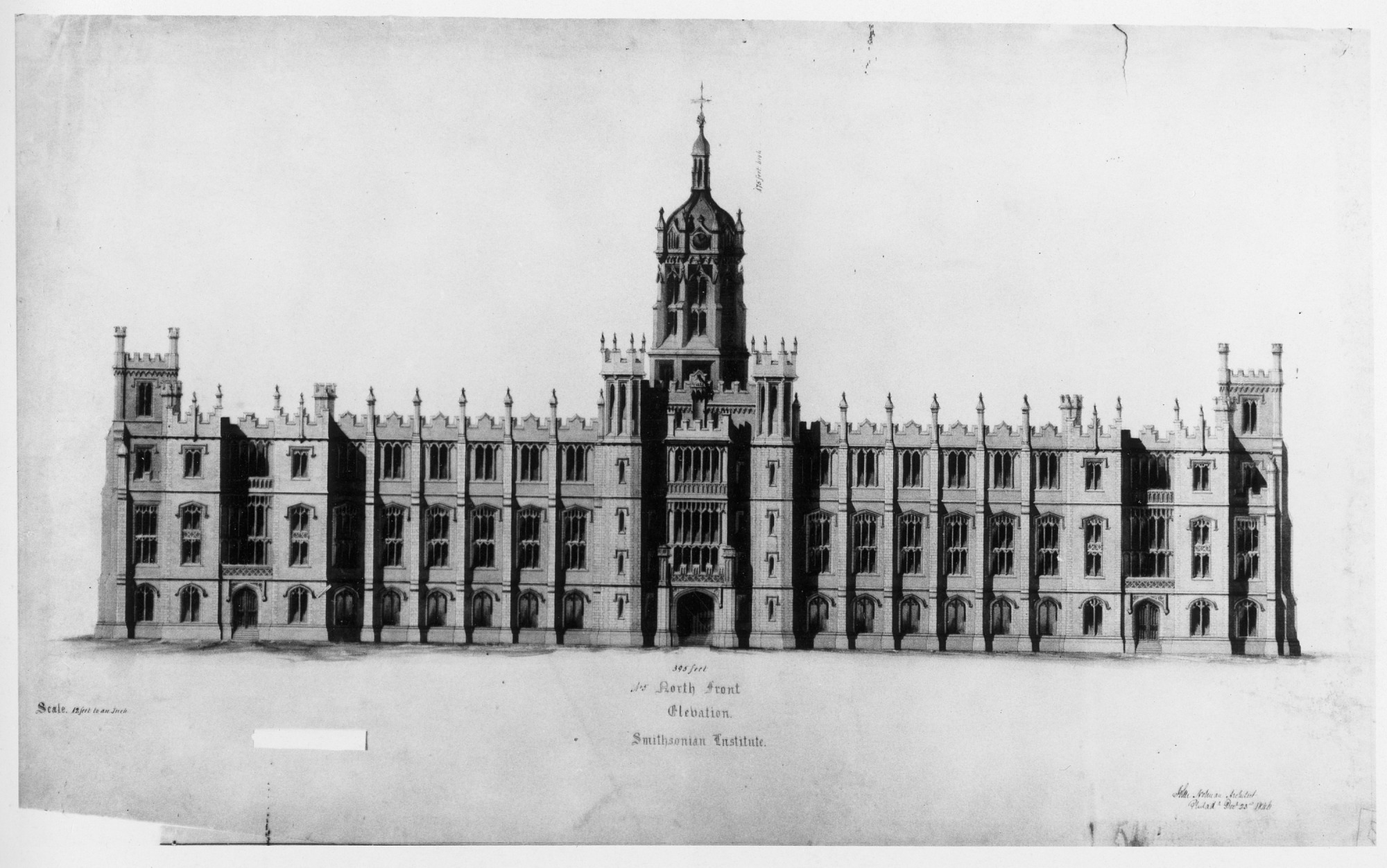 Proposed design for Smithsonian Institution Building by John Notman, north front elevation. It is a Gothic design with three stories, a central tower/cupola, crenellated embattlements, and symmetrical wings. The design was submitted for the competition sponsored by the Building Committee of the Board of Regents, December 23, 1846.