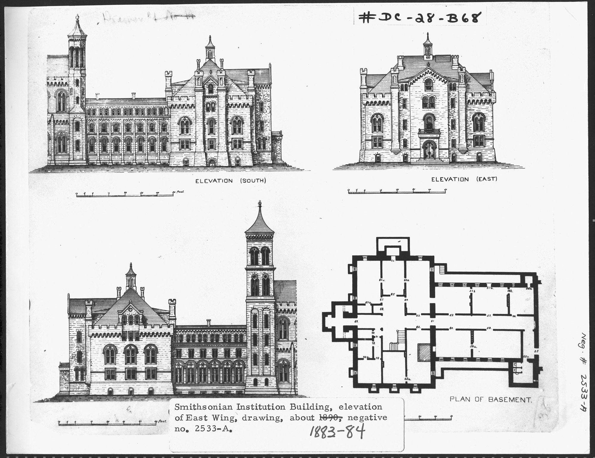 Elevations and Basement Plans for the reconstruction of the East Wing of the Smithsonian Institution Building by Adolph Cluss.
