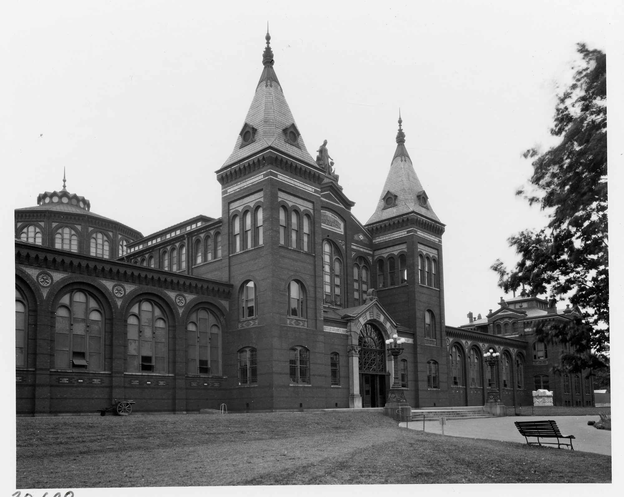 Exterior view of the north side of the United States National Museum building, now known as the Arts and Industries Building, has the redesigned entrance, which has been completely filled in with glass by architects Hornblower and Marshall, c. 1902 - 1907. A cannon can be seen to the left of the central protruding vestibule. The Syrian sarcophagus, brought to the United States in 1839, and placed outside the U.S. National Museum May 19, 1883, is visible at right. At the far right corner of the photo, a portion of the Smithsonian Astrophysical Observatory in the South Yard is visible.