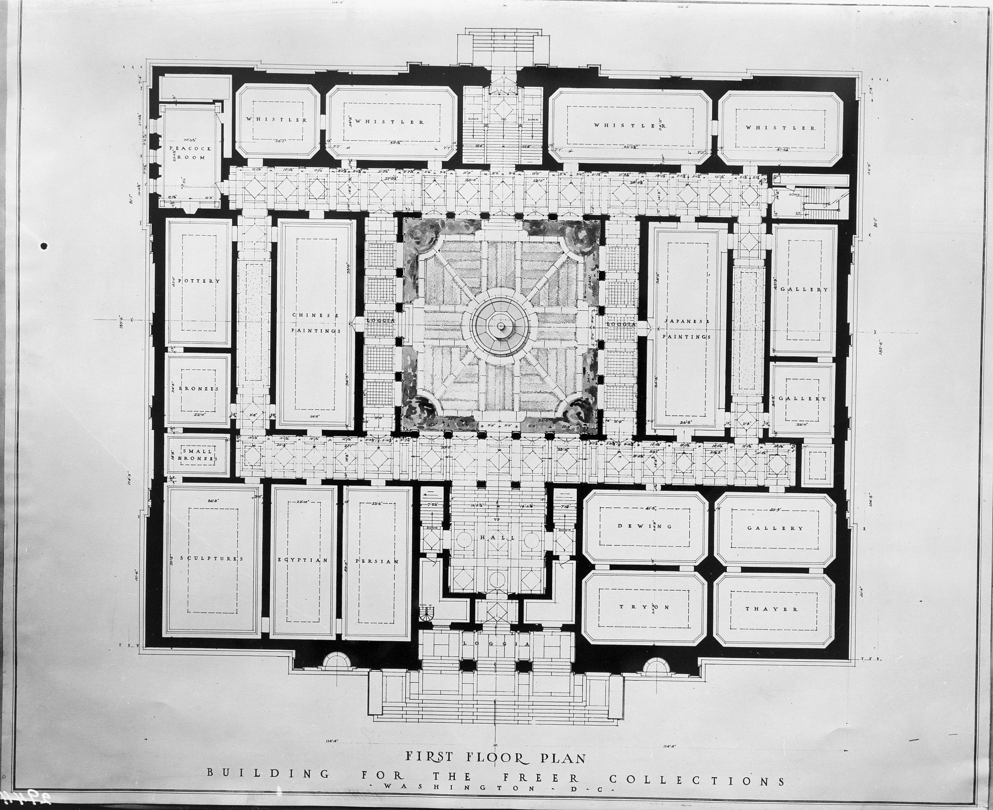 First floor plan for the Freer Gallery of Art indicating gallery arrangement and courtyard design. The building was designed by Charles A. Platt.
