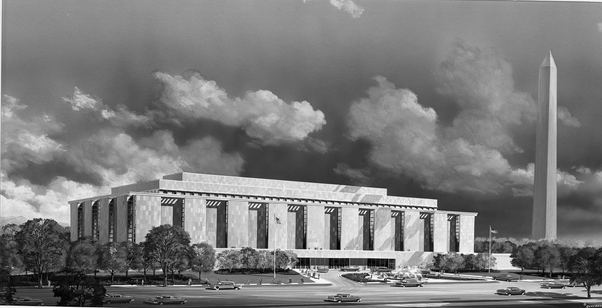 Rendering of the north front of the Museum of History and Technology (MHT), now the National Museum of American History (NMAH), photographed from a colored drawing made by Elliot Glushak in 1961. The building was designed by the architectural firm McKim, Mead, and White and their successor firm, Steinman, Cain, and White. The museum opened to the public on January 23, 1964. The Washington Monument is drawn on the right.