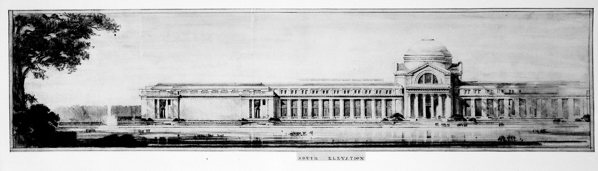 Exterior south elevation (detail), designed by The Allied Architects of Washington, D.C., December 1931. These wings, authorized in the Smoot-Elliott bill (approved June 19, 1930), were never built. By Fiscal Year 1933 when the first appropriation of $1,200,000 to begin construction was proposed, budget restrictions forced the shelving of the project. "Owing to the financial situation that arose and the necessary restrictions that this imposed in the National Budget, it was not practicable to include this item in the estimates finally submitted to Congress, nor was there later opportunity to consider it favorably." (USNM Annual Report 1932, pp. 4-5).