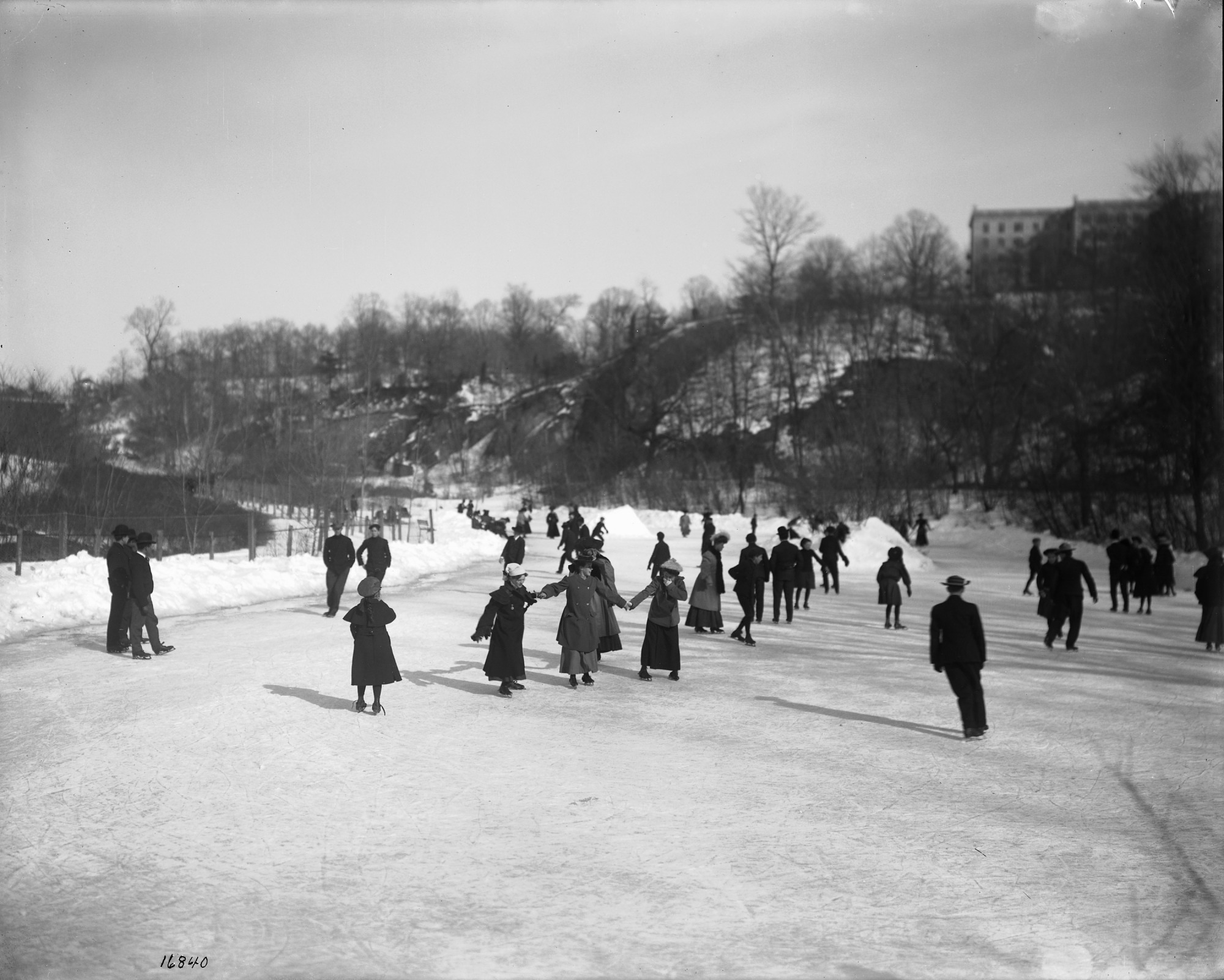 On the grounds of the National Zoological Park at the turn of the century, ice skaters are enjoying skating on frozen Rock Creek.