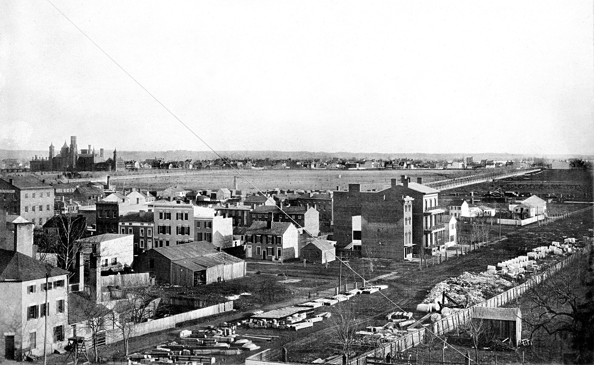 The Smithsonian Institution Building (SIB) seen from downtown Washington, D.C., from across The Mall, around 1855. In the foreground are construction materials along 15th Street, NW for the new wing added in 1855 to the Treasury Building. The Treasury building is the oldest departmental building in Washington, D.C.having been completed in 1842 and expanded three times by 1869. Residential and commercial buildings in the foreground are between 15th and 14th Streets, NW. This area was also known in the 1860s as the red light district called Murder Bay. The canal bordering the Mall before being converted to form Constitution Avenue is the sliver at right center. The white residence at the far left is at the corner of 15th Street and Pennsylvania Avenue, NW.