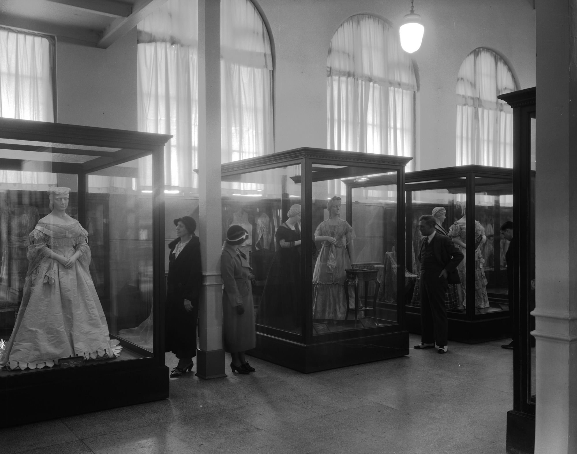 The First Ladies Hall was housed in the Arts & Industries Building from 1912 until it moved in the 1960's to the Museum of History and Technology, now the National Museum of American History. From 1912 until 1955 the gowns were displayed in cases, as seen here in the 1920's. After 1955 gowns were displayed in room settings. Exhibit cases of First Ladies Gowns were probably in the northwest range of the Arts and Industries Building. A woman is looking in the case to the left at the dress of Harriet Lane Johnston, niece of President James Buchanan. A woman and a man are looking in the case to the right which contains the dress of Jane Appleton Pierce (left), wife of President Franklin Pierce, and a dress of Abigail Powers Fillmore (right), wife of President Millard Fillmore.