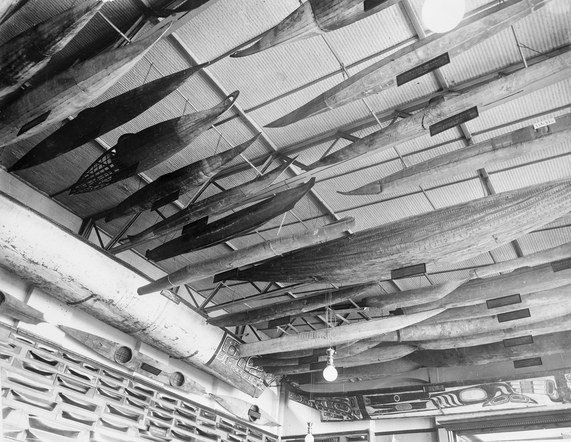 The Water Transportation Hall, also known as "Boat Hall," located in the Northeast Range of the U.S. National Museum, now the Arts and Industries Building. Canoes are hung from the ceiling. Models of boats can be seen exhibited along the wall. Haida canoes can be seen at the bottom right. The exhibit was on view from 1881 when the building opened through the late 1960s.