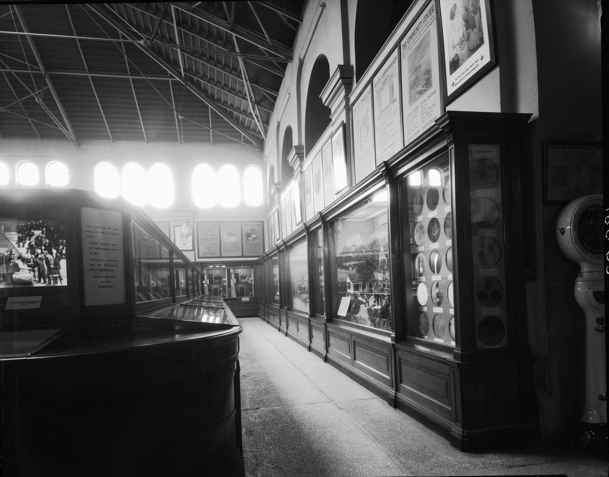 The Public Health Exhibit is installed in the balcony of the southeast court around 1924; it appears on the floorplan of the 1925 Guidebook and remains there through 1965. The closest exhibit panel reads "The exhibits of this gallery are to teach that Public Health can be purchased with money. Personal health can be obtained with knowledge. "Look Carefully! Think! Remember!"