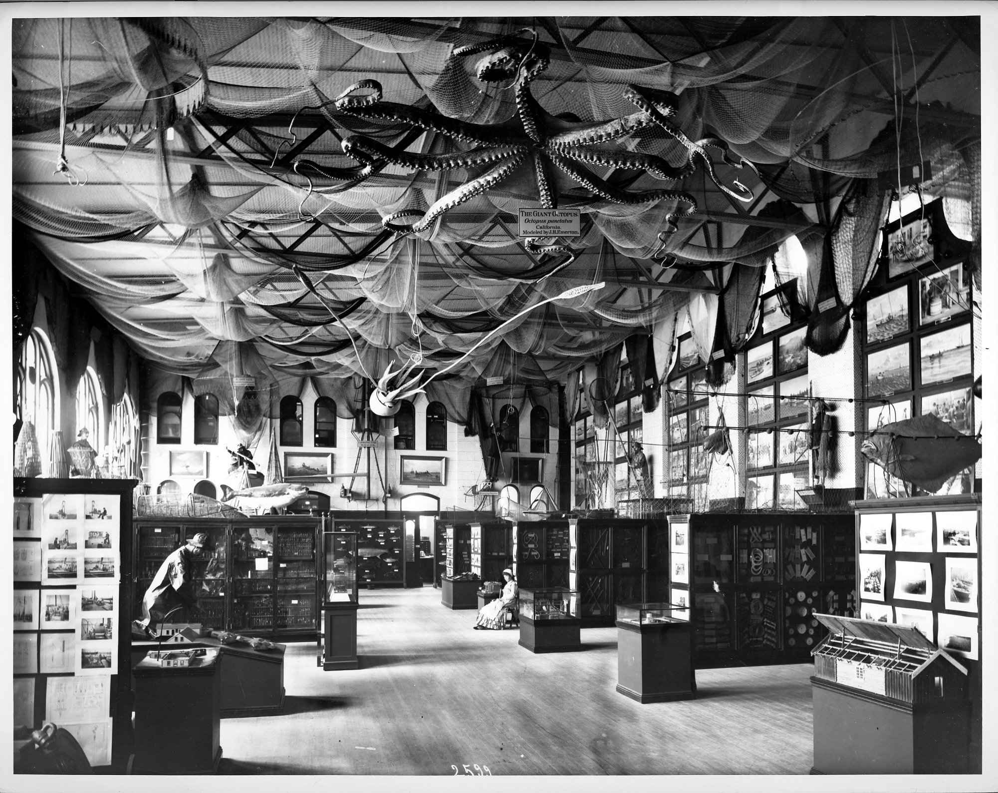 Fisheries Exhibit in the northeast Range of the United States National Museum Building (Arts and Industries Building), with female attendant seated in the center. The wood floors in the building were replaced between 1895 and 1905.