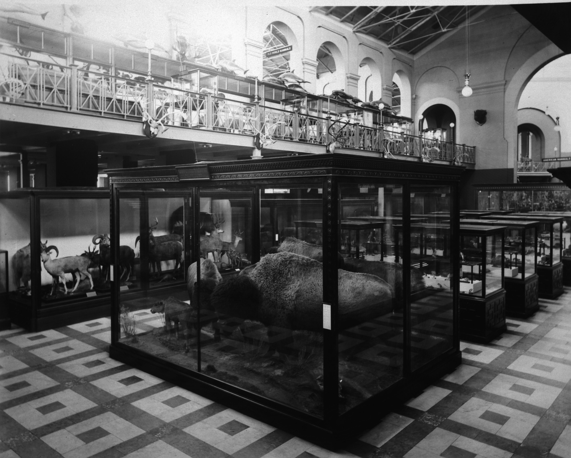 Bison mounted by William Temple Hornaday in 1887 in the South Hall of the Arts and Industries Building. Photo shows the galleries (balconies) constructed by Hornblower and Marshall between 1897 and 1903. Adolph Cluss' stencil in the rotunda has been painted out, presumably in preparation for Grace Lincoln Temple's design which was completed in 1902. Other animals are visible in the surrounding cases.