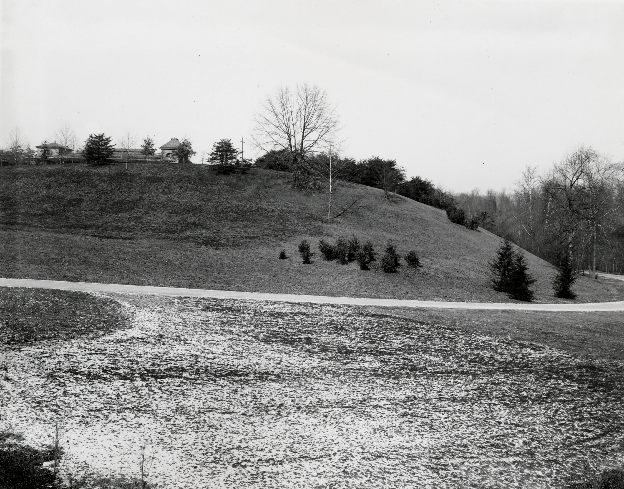 Grounds of the National Zoological Park, looking up the hill towards the Carnivora or Animal House, the first "permanent" stone structure in the Park. This hill is the site of the Easter Monday Egg Rolls.