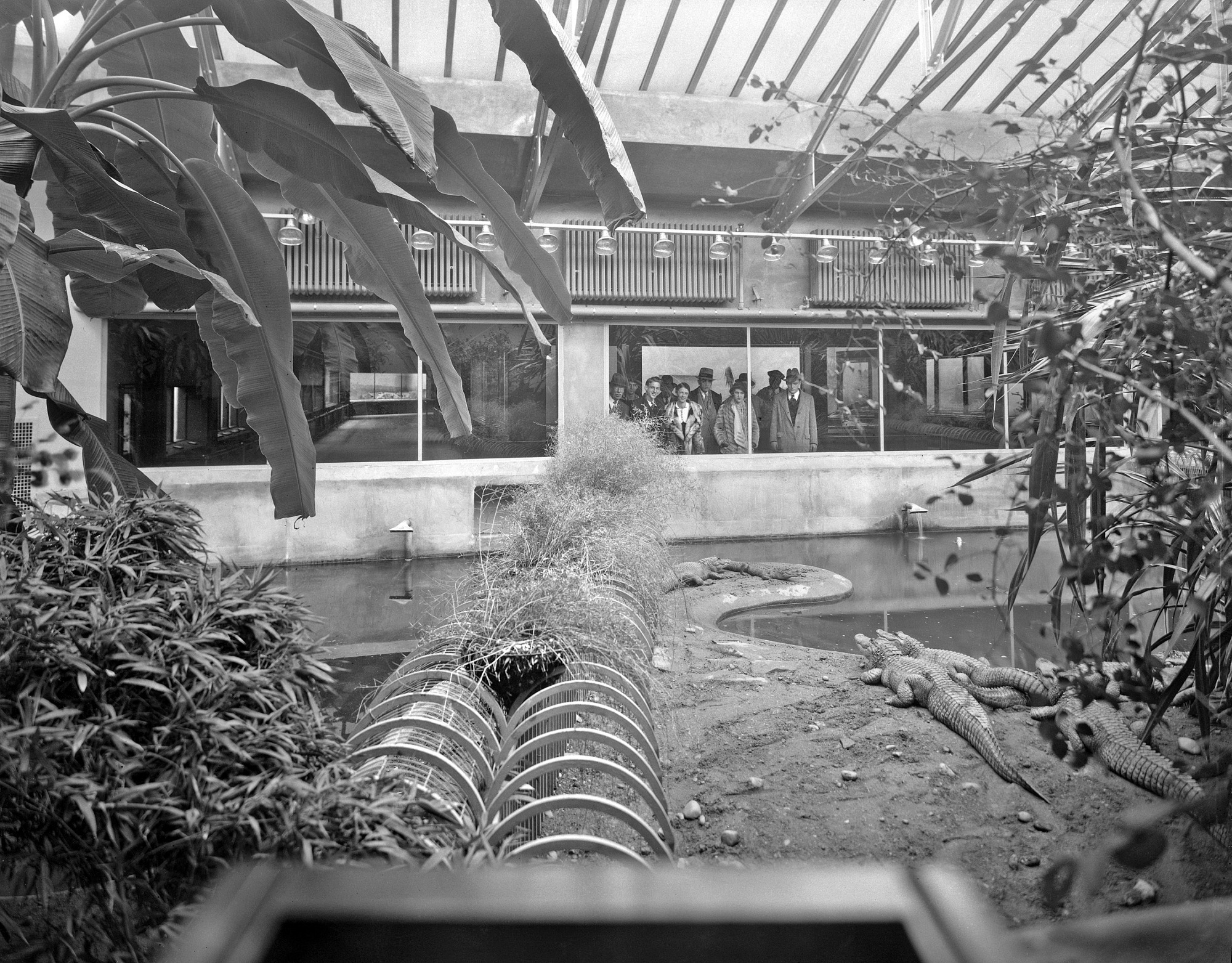 Visitors viewing the new alligator exhibit in the recently opened Reptile House at the National Zoological Park. The new exhibit has more natural surroundings than previous ones.
