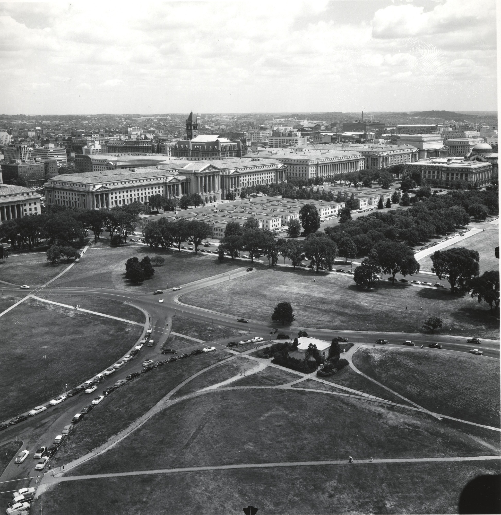 Aerial view from the Washington Monument showing the "Tempos" or temporary buildings before their demolition. They were located on the site of the future National Museum of History and Technology (NMHT), now the National Museum of American History (NMAH).