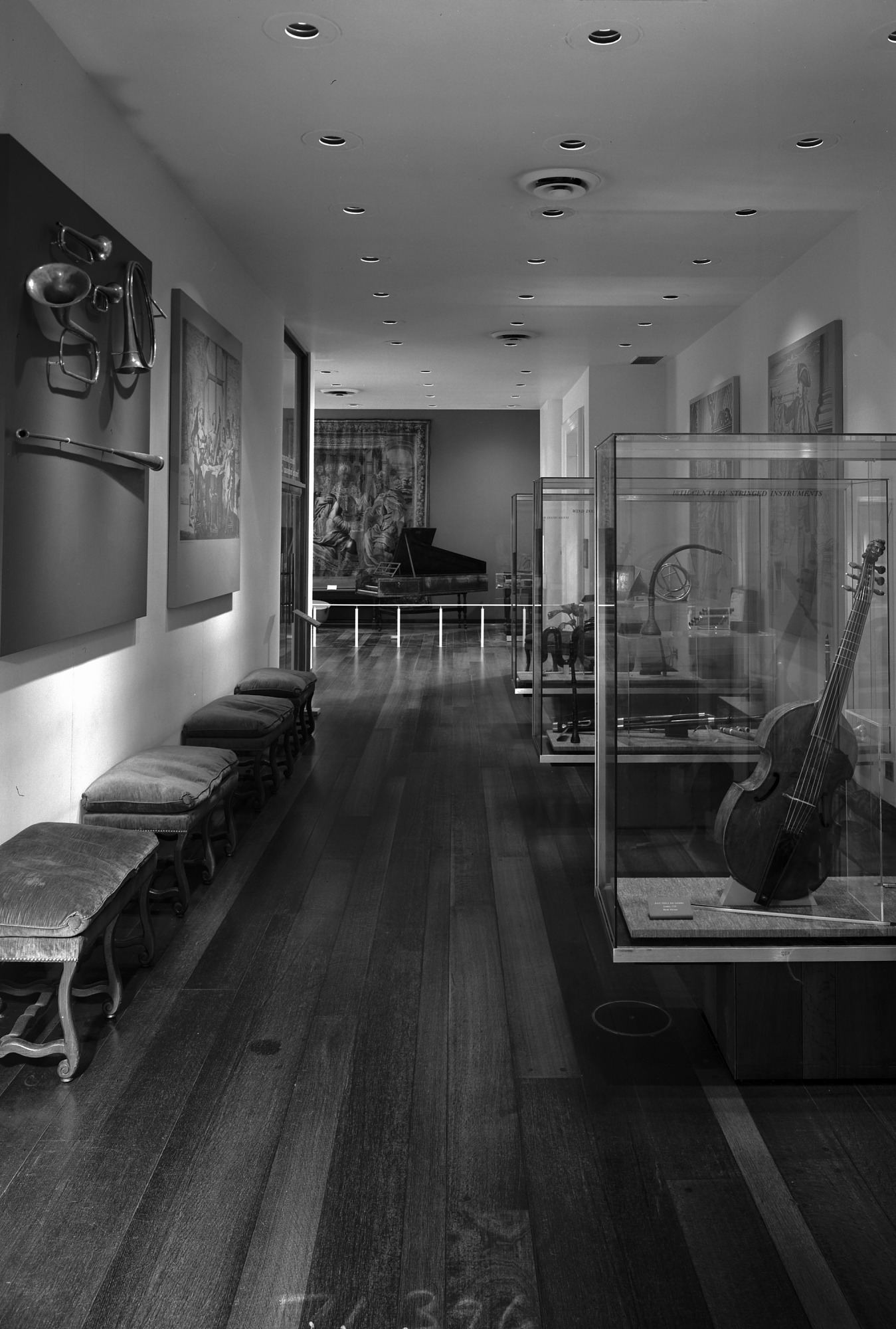 View of the Hall of Musical Instruments in the National Museum of History and Technology (NMHT), now the National Museum of American History (NMAH). Cases of instruments including a cello and French horn are visible on the right side of the photograph, benches and a wall mounted instrument are on the left. A grand piano is in the background.
