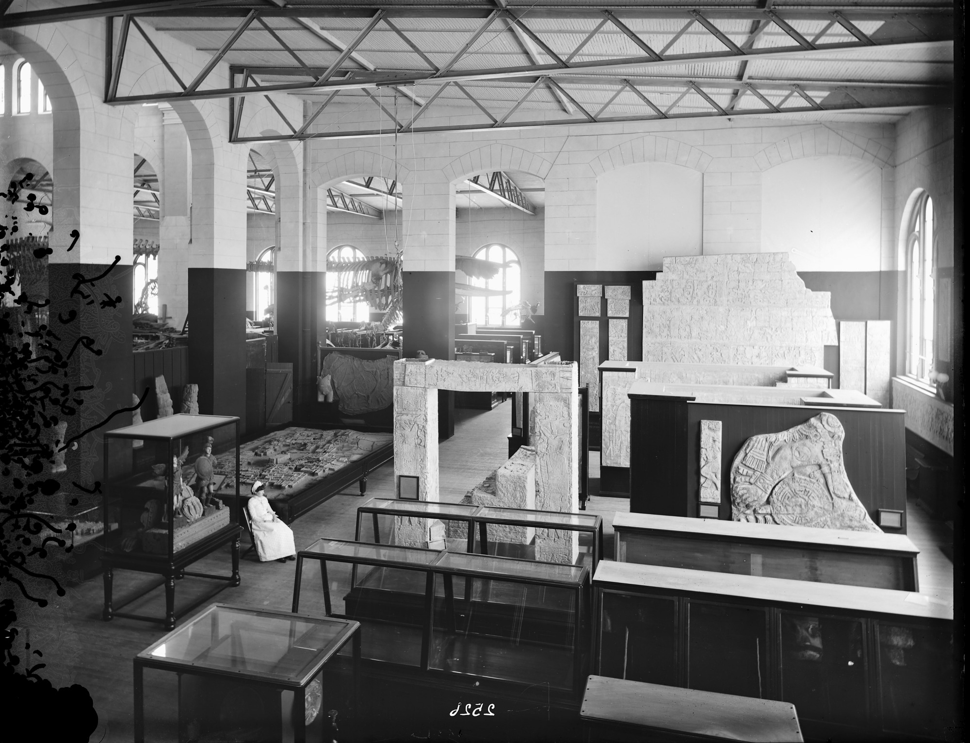 Prehistoric Archeology Exhibit was in the Southeast Range of the U.S. National Museum Building, now the Arts and Industries Building. A female attendant is seated in the hall. In the background the dinosaur skeletons of the paleontology exhibit are visible.