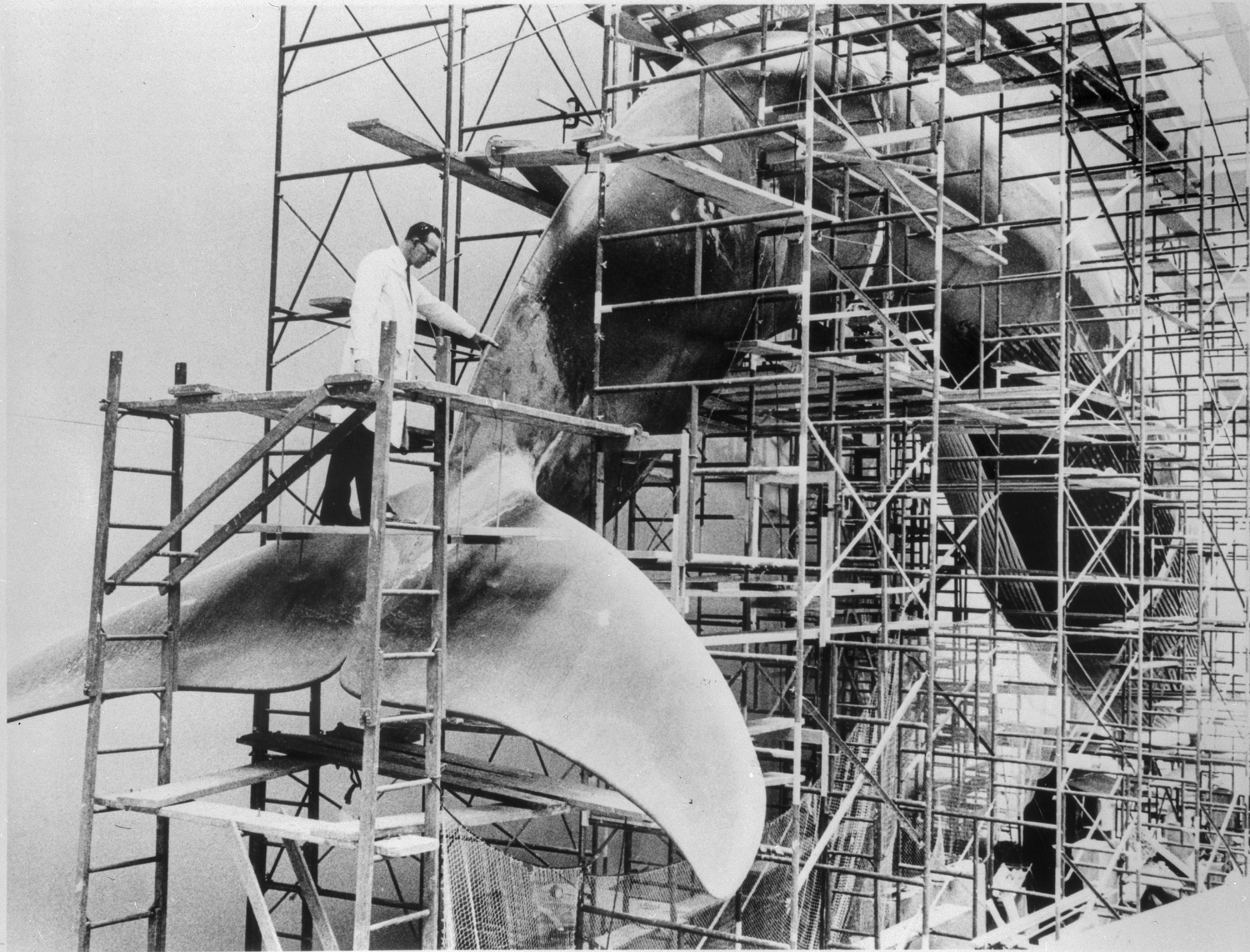 Taxidermist/model maker John Widener working on the cast model of the Blue whale, the largest animal that has ever lived, which is to be featured in the new "Life in the Sea" exhibit in the National Museum of Natural History.